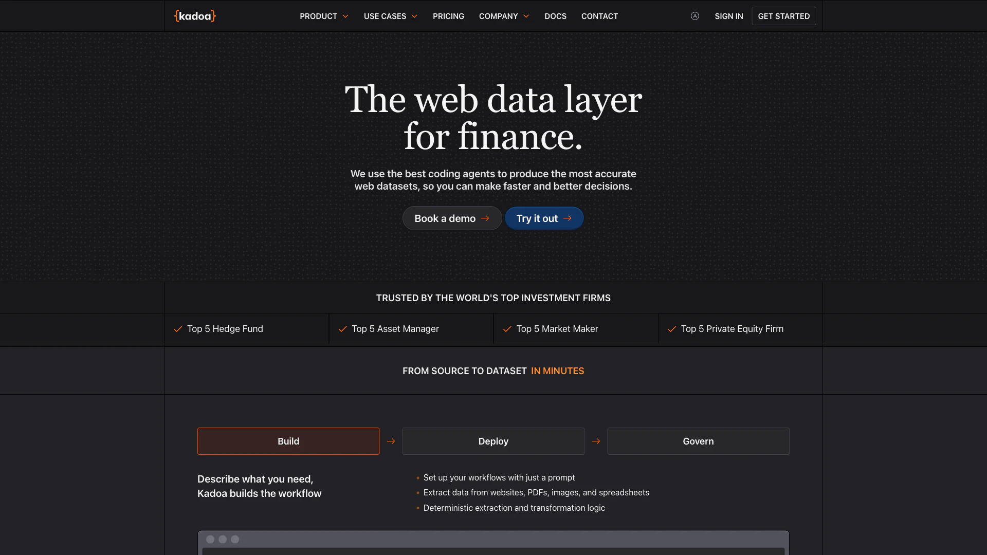 Kadoa es una plataforma de datos web diseñada para empresas de inversión, que proporciona una recolección de datos web sin esfuerzo, confiable y conforme a la normativa a gran escala para agentes de IA y analistas.