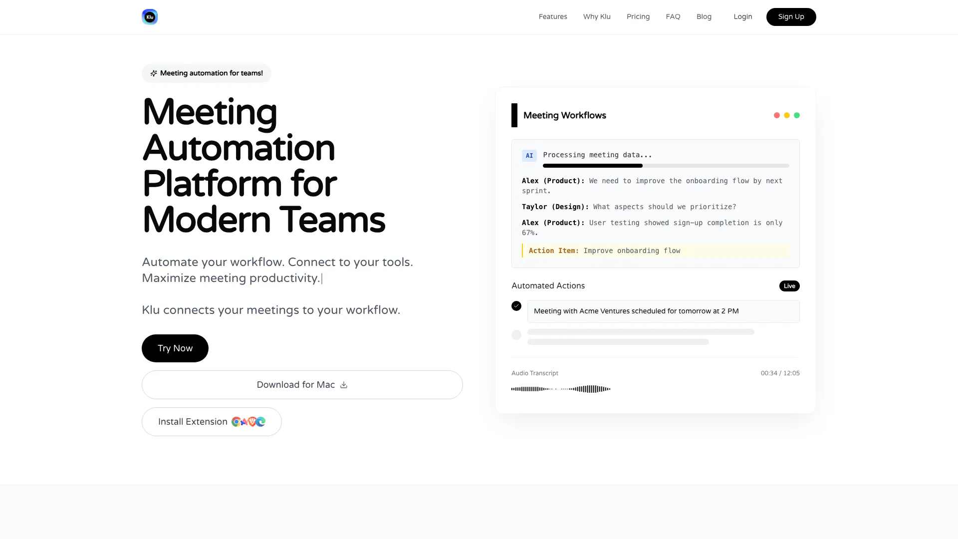 Klu conecta tus reuniones a tu flujo de trabajo con potentes automatizaciones que ahorran tiempo y aumentan la productividad.