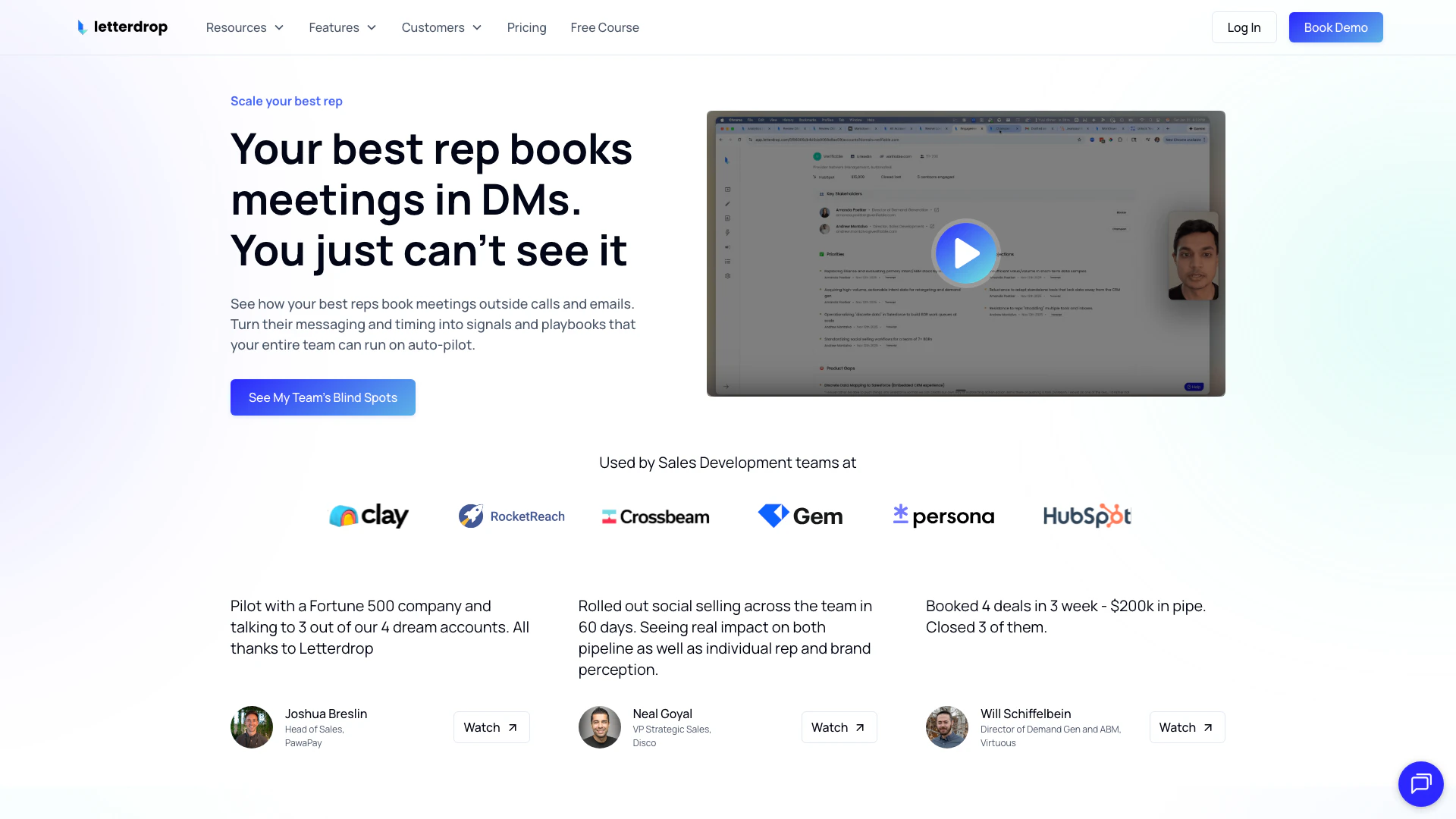 - Playbooks automatizados para SDRs: Letterdrop permite a los representantes de desarrollo de ventas (SDRs) automatizar sus mensajes y señales en playbooks, lo que permite que todo el equipo realice un alcance efectivo automáticamente.