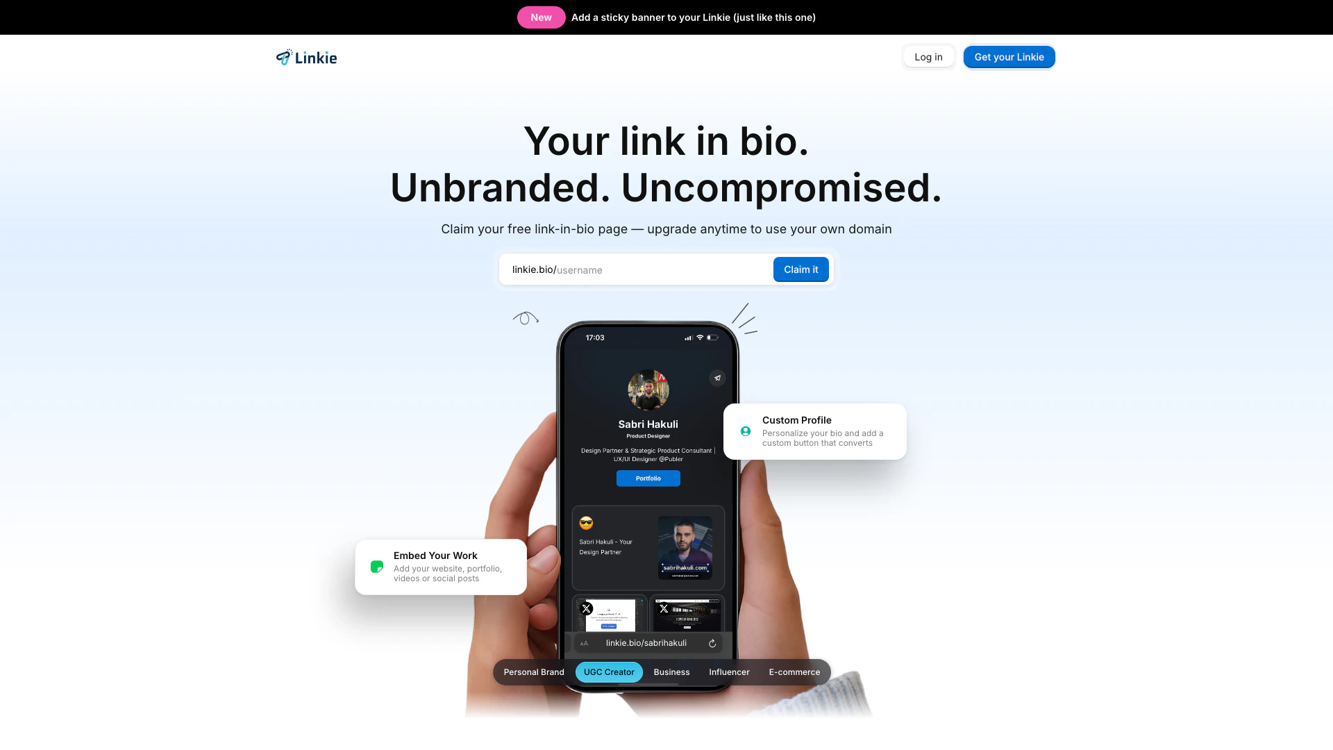 Usa una Página Linkie, agrega tarjetas ilimitadas, incrustaciones de publicaciones sociales, enlaces de sitios web y miniaturas personalizadas.