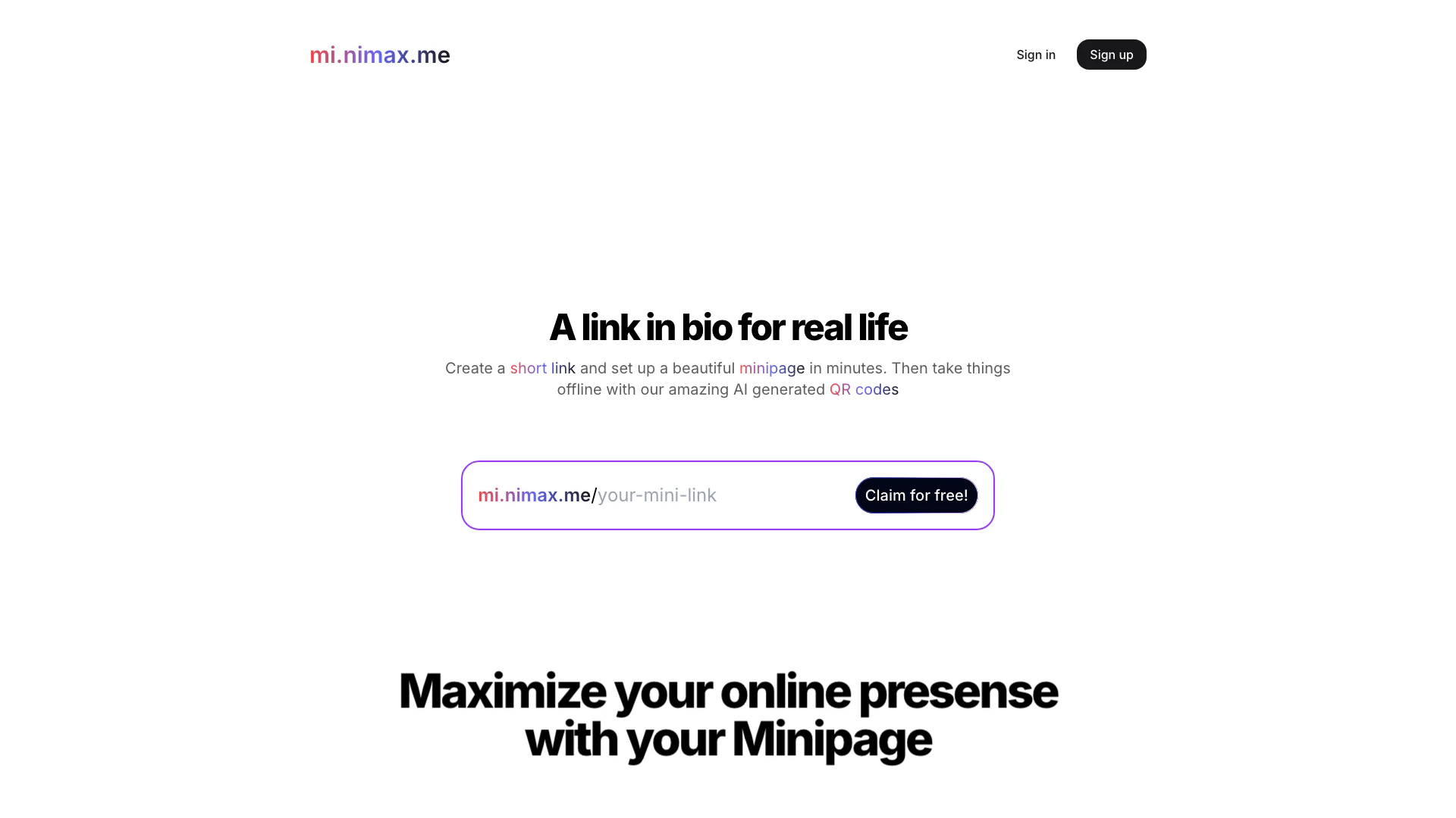 - Códigos QR Generados por IA: Genera códigos QR únicos que se pueden usar para compartir tu minipágina en formatos físicos.