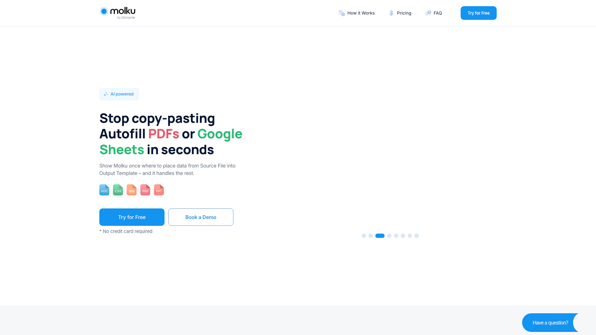 Molkuai es una herramienta innovadora impulsada por IA diseñada para automatizar el proceso de transferencia de datos de varios documentos a plantillas personalizables, como PDFs o Google Sheets. Al eliminar la necesidad de copiar y pegar manualmente, Molkuai agiliza la gestión de documentos, permitiendo a los usuarios completar formularios y plantillas de manera eficiente en segundos. Con sus capacidades inteligentes de extracción de datos, Molkuai no solo ahorra tiempo, sino que también mejora la precisión al manejar diseños complejos e incluso documentos manuscritos.