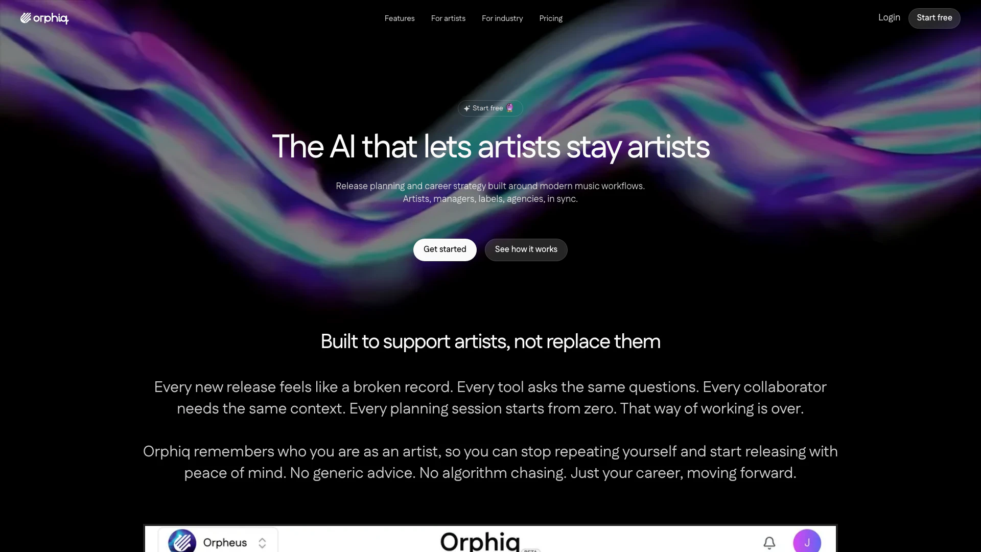 Orphiq es una herramienta de planificación de lanzamientos y estrategia de carrera nativa de IA para artistas musicales y los equipos que los apoyan. Te ayuda a planificar lanzamientos, obtener ideas de contenido y tomar mejores decisiones de carrera sin necesidad de contratar a un equipo completo. El estratega musical de IA de Orphiq, Apolo, está entrenado específicamente en las mejores prácticas de la industria musical.