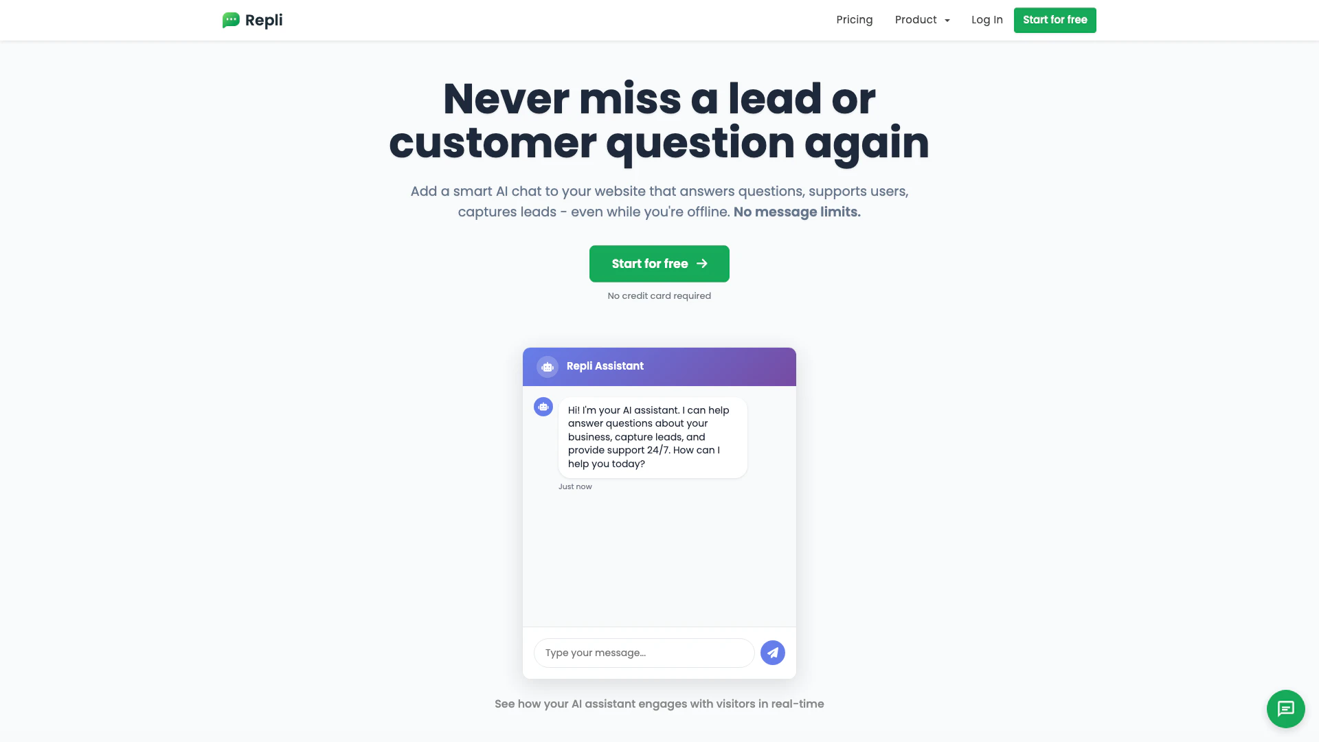 Repli proporciona un widget de chat inteligente que puedes agregar fácilmente a tu sitio web. Responde a las preguntas de los visitantes, ofrece soporte, captura clientes potenciales y puede ser entrenado con tu contenido específico (páginas web, documentos, preguntas frecuentes) para proporcionar respuestas relevantes y alineadas con la marca las 24 horas, los 7 días de la semana.