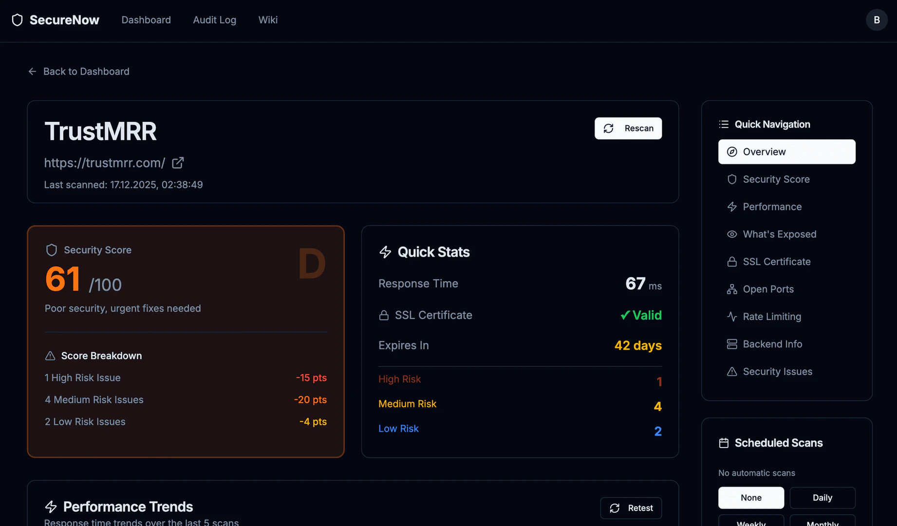 - Escaneo de seguridad automatizado: Escanea rápidamente en busca de vulnerabilidades y problemas de rendimiento. - Informes de seguridad detallados: Recibe informes con clasificaciones de severidad e instrucciones paso a paso para soluciones. - Recomendaciones de solución instantáneas: Accede a soluciones prácticas, incluidos fragmentos de código y configuraciones. - Monitoreo continuo: Configura escaneos programados para mantener la seguridad a lo largo del tiempo con notificaciones por correo electrónico. - Puntuación de seguridad: Realiza un seguimiento de tu puntuación de seguridad general y mejoras en comparación con los estándares de la industria.