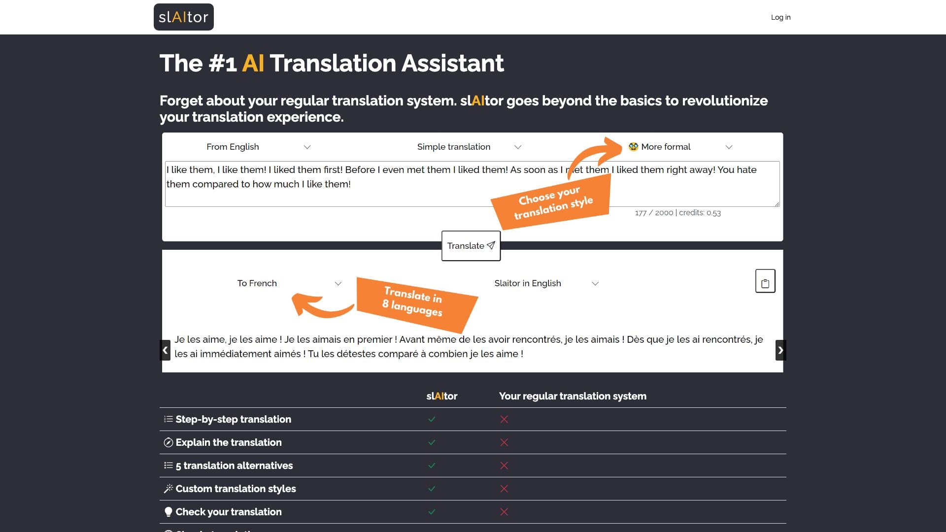 slAItor es un nuevo tipo de motor de traducción que aprovecha los recientes avances en inteligencia artificial. slAItor puede explicar una traducción y corregir tus traducciones. También está disponible un calibrador de estilo que te permite adaptar tu traducción a diferentes contextos.