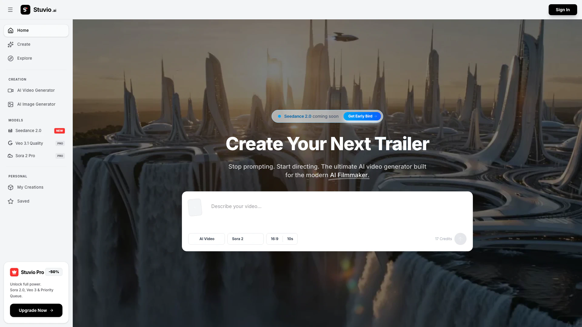 Stuvioai es un generador de video AI avanzado diseñado para creadores modernos, que ofrece herramientas poderosas como Seedance 2.0, Veo 3.1 y Wan 2.6. Permite a los usuarios tomar el control de la producción cinematográfica, proporcionando una plataforma integral que combina múltiples modelos de AI para generar videos de alta calidad. Stuvioai está construido específicamente para cineastas de AI, permitiéndoles crear películas de manera eficiente y efectiva al gestionar varios aspectos de la producción de video, desde la iluminación y el movimiento de la cámara hasta la consistencia de los personajes.