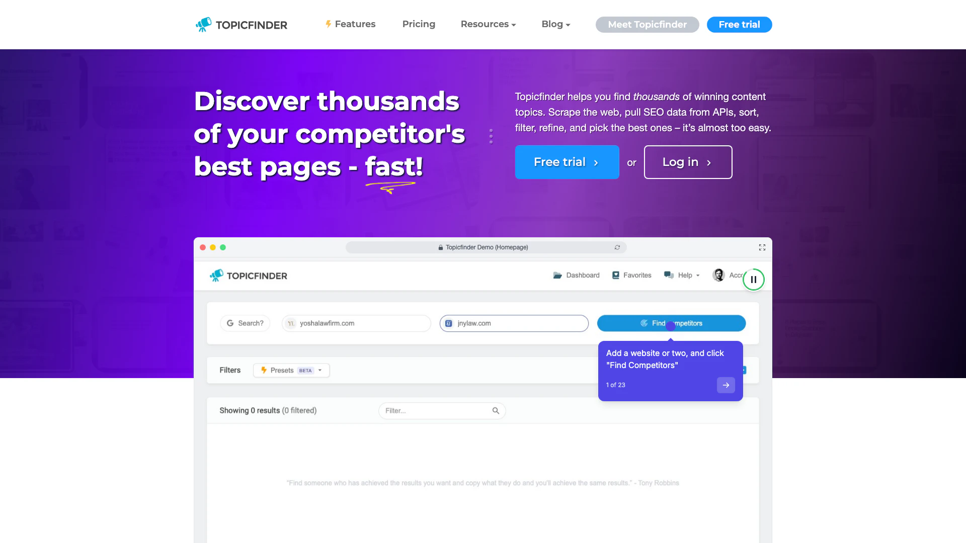 - Regístrate para una prueba gratuita en el sitio web de Topicfinder e inicia sesión en tu cuenta.
