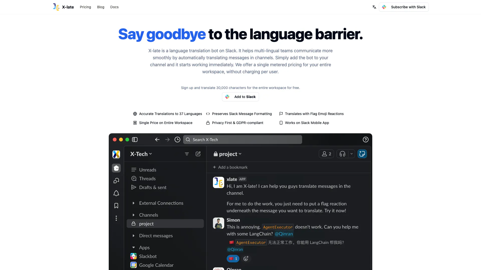 Traducciones impulsadas por IA, asientos ilimitados en el espacio de trabajo de Slack, emoji de bandera para traducir, 37 idiomas, 30,000 caracteres en total.