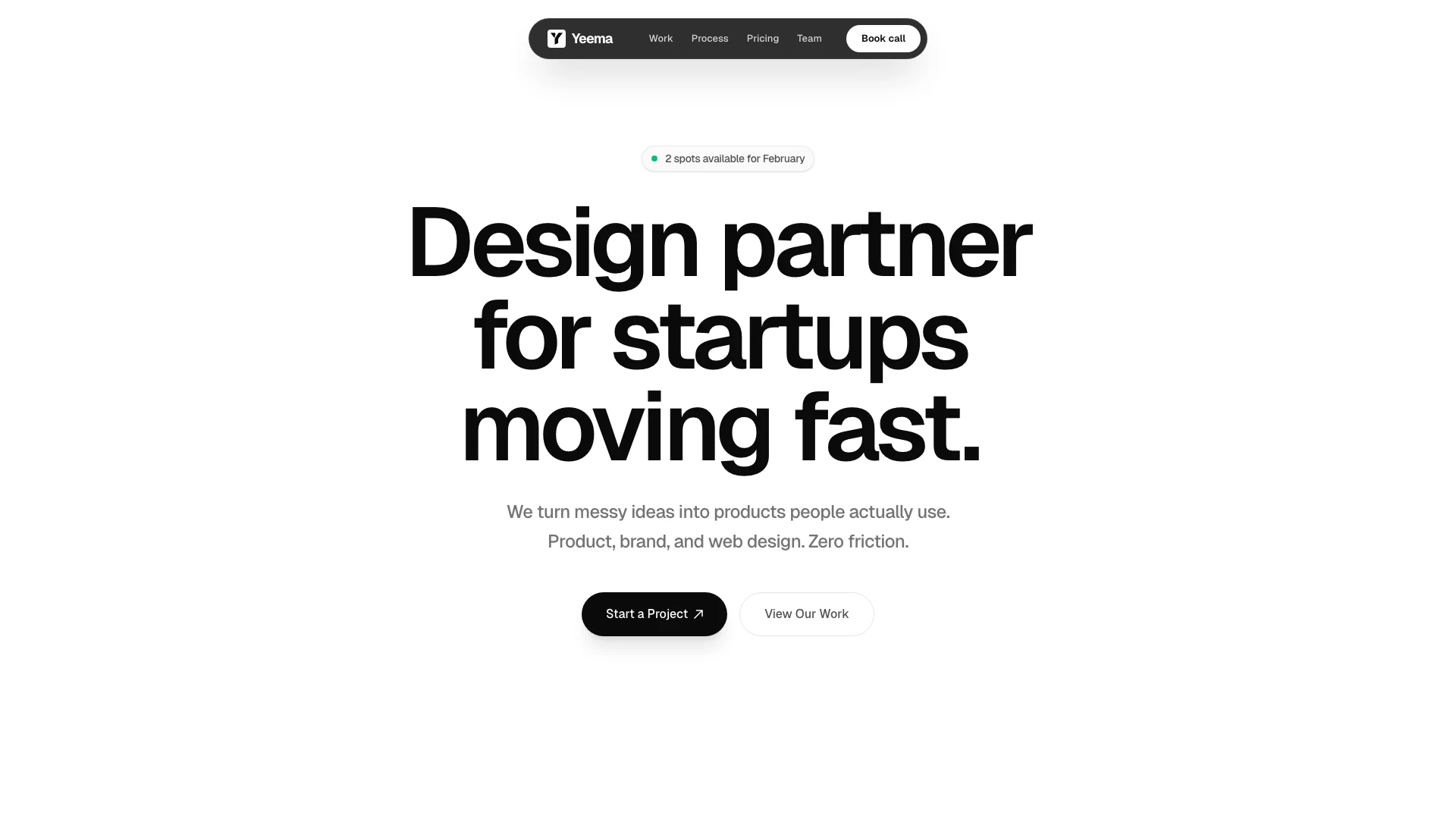 Yeema está diseñado para fundadores, startups y emprendedores que buscan transformar sus ideas innovadoras en productos tangibles. Se dirige a aquellos que aprecian un proceso de diseño fluido y colaborativo y buscan un socio de diseño que comprenda la naturaleza acelerada del desarrollo de startups. Ya sea que estés en las primeras etapas de tu startup o buscando perfeccionar un producto existente, Yeema proporciona la experiencia y el apoyo necesarios para dar vida a tu visión.