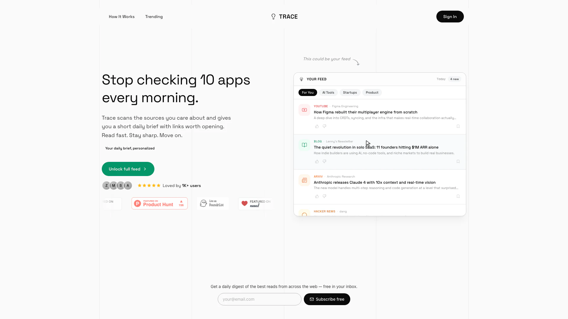 Solía revisar Twitter, Reddit y HN por separado cada mañana. Ahora abro Trace una vez y tengo todo. Es como RSS, pero realmente funciona.