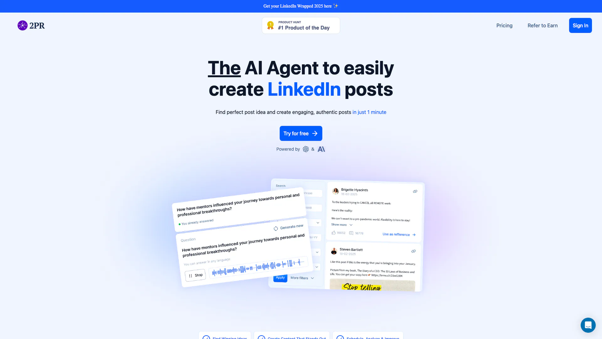 - Création de contenu alimentée par l'IA: 2pr utilise la technologie IA pour générer rapidement des publications LinkedIn engageantes, permettant aux utilisateurs de créer du contenu en moins d'une minute.