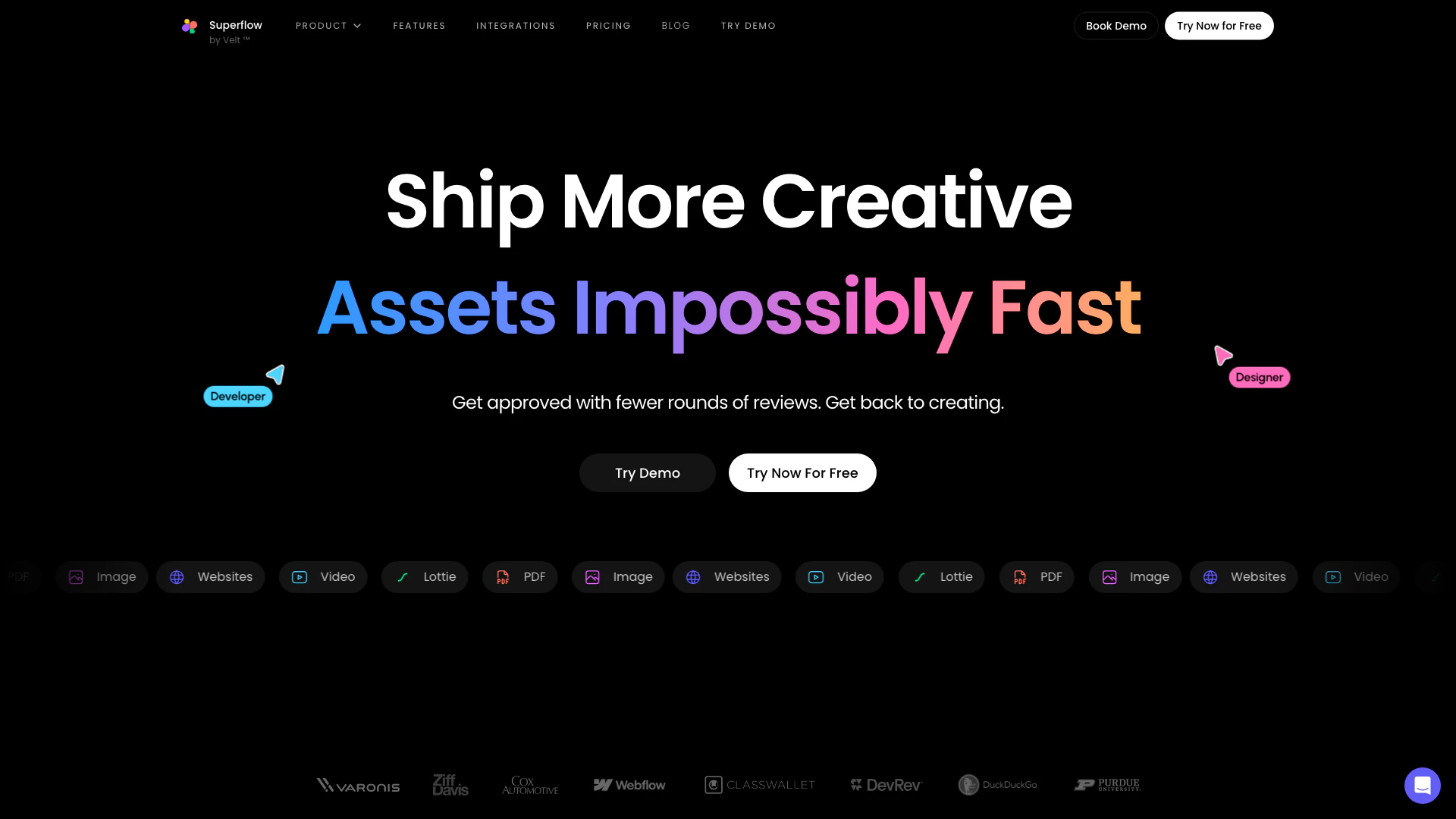 Superflow est un outil collaboratif conçu pour les agences et les équipes marketing afin de livrer des actifs de haute qualité beaucoup plus rapidement. Il permet aux utilisateurs de commenter et de collaborer sur divers types d'actifs, y compris des sites web en direct, des vidéos, des PDF, des fichiers Lottie, des images, et plus encore.