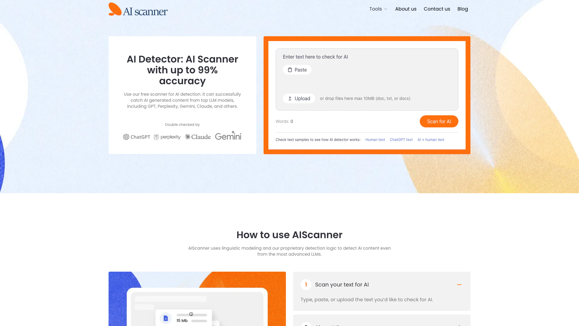 - Scannez votre texte pour l'IA : Tapez, collez ou téléchargez le texte que vous souhaitez vérifier pour du contenu généré par l'IA.