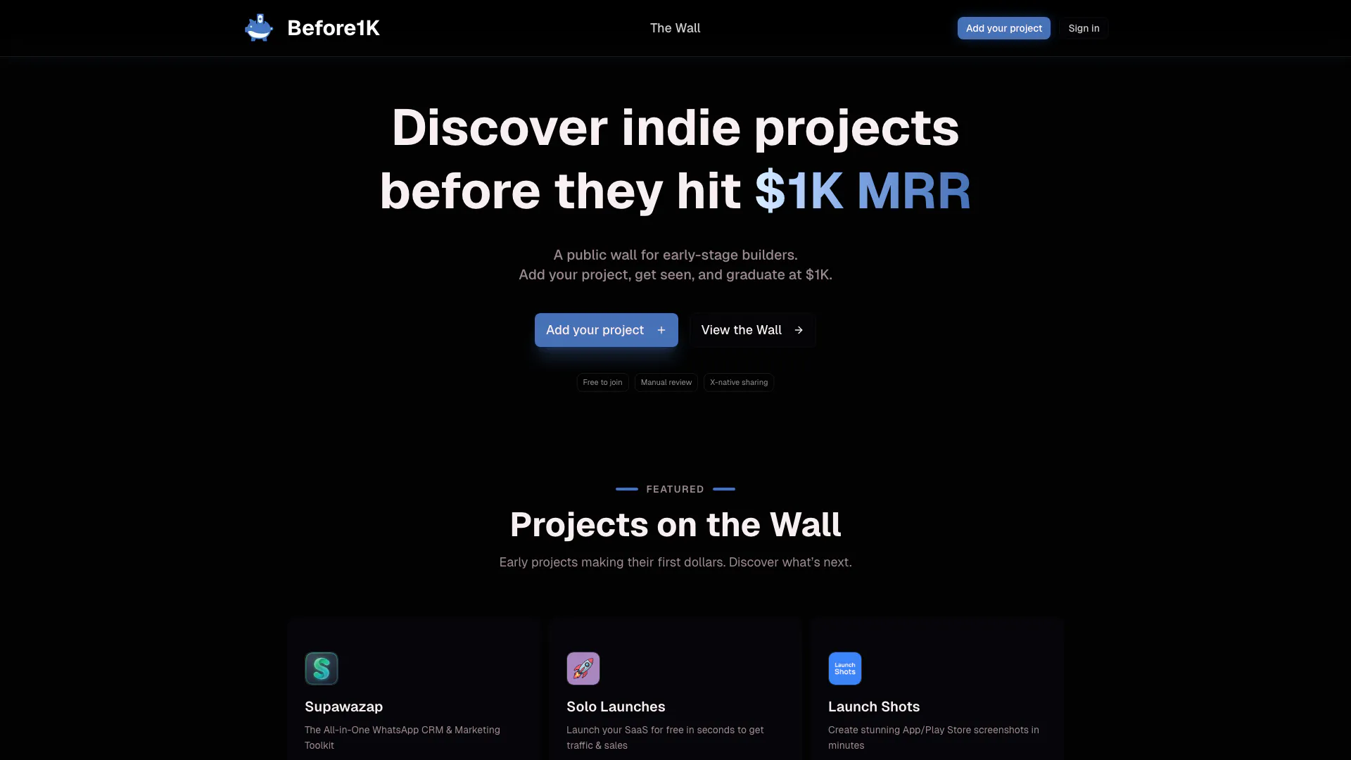 - Soyez mis en avant : Après une révision manuelle, votre projet sera présenté sur le mur de Before1K, permettant aux premiers utilisateurs de découvrir et d'interagir avec votre travail.