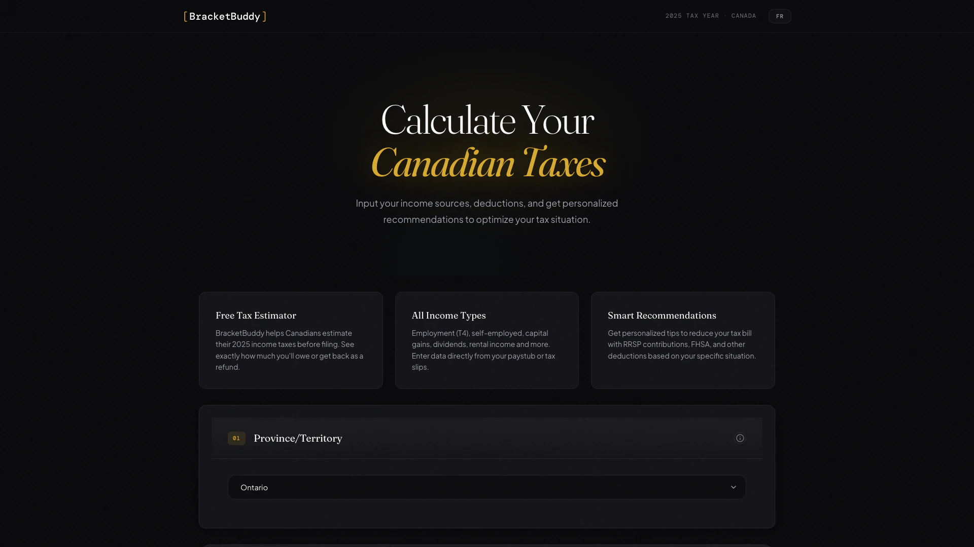 BracketBuddy est un calculateur d'impôts canadien gratuit pour l'année fiscale 2025 qui aide les utilisateurs à estimer leurs impôts fédéraux et provinciaux, à voir leur tranche d'imposition et à obtenir des recommandations pour les cotisations RRSP et FHSA.