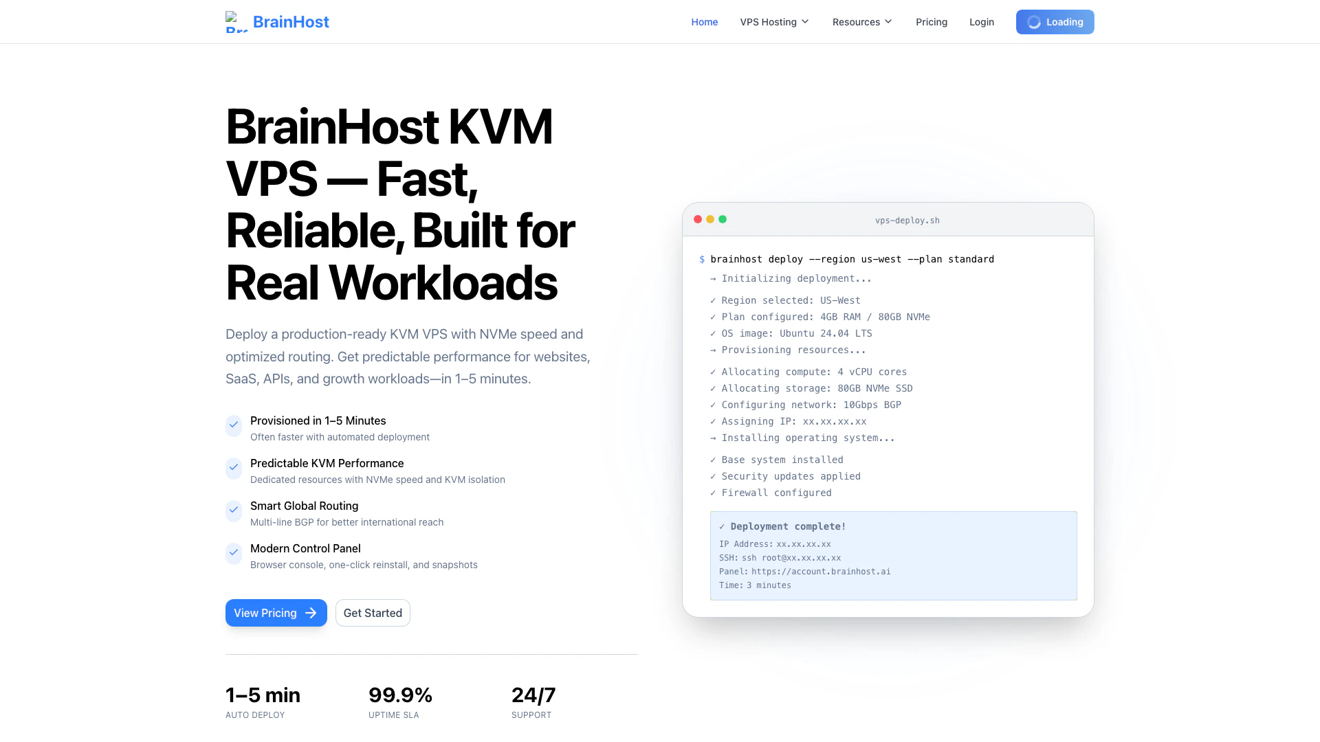 - Visitez le site Web de BrainHost et choisissez votre plan VPS souhaité en fonction de vos besoins en charge de travail. 2. Sélectionnez la région (États-Unis - Ouest ou Hong Kong) où vous souhaitez que votre serveur soit déployé. 3. Complétez le processus de paiement pour provisionner votre VPS, ce qui prend généralement entre 1 et 5 minutes. 4. Accédez à votre serveur en utilisant les identifiants SSH fournis et gérez votre serveur via le panneau de contrôle moderne. 5. Utilisez des fonctionnalités telles que l'accès root, les instantanés et la protection DDoS pour optimiser les performances de votre serveur.