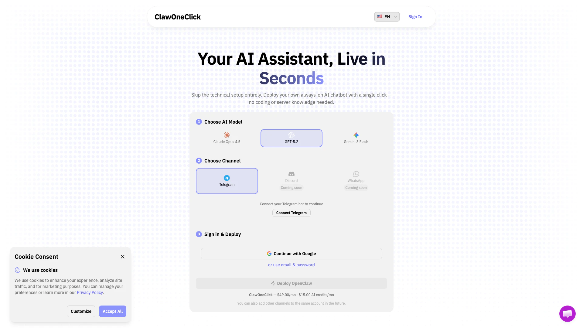 Pour utiliser ClawOneClick, suivez ces étapes : 1. Choisissez un modèle IA : Sélectionnez parmi les modèles IA disponibles comme Claude Opus 4.5, GPT-5.2 ou Gemini 3 Flash. 2. Sélectionnez un canal : Choisissez la plateforme de messagerie où votre assistant IA fonctionnera, comme Telegram ou Discord. 3. Connectez-vous et déployez : Connectez-vous avec votre compte Google ou votre email et mot de passe, puis appuyez sur le bouton de déploiement pour lancer votre assistant IA.