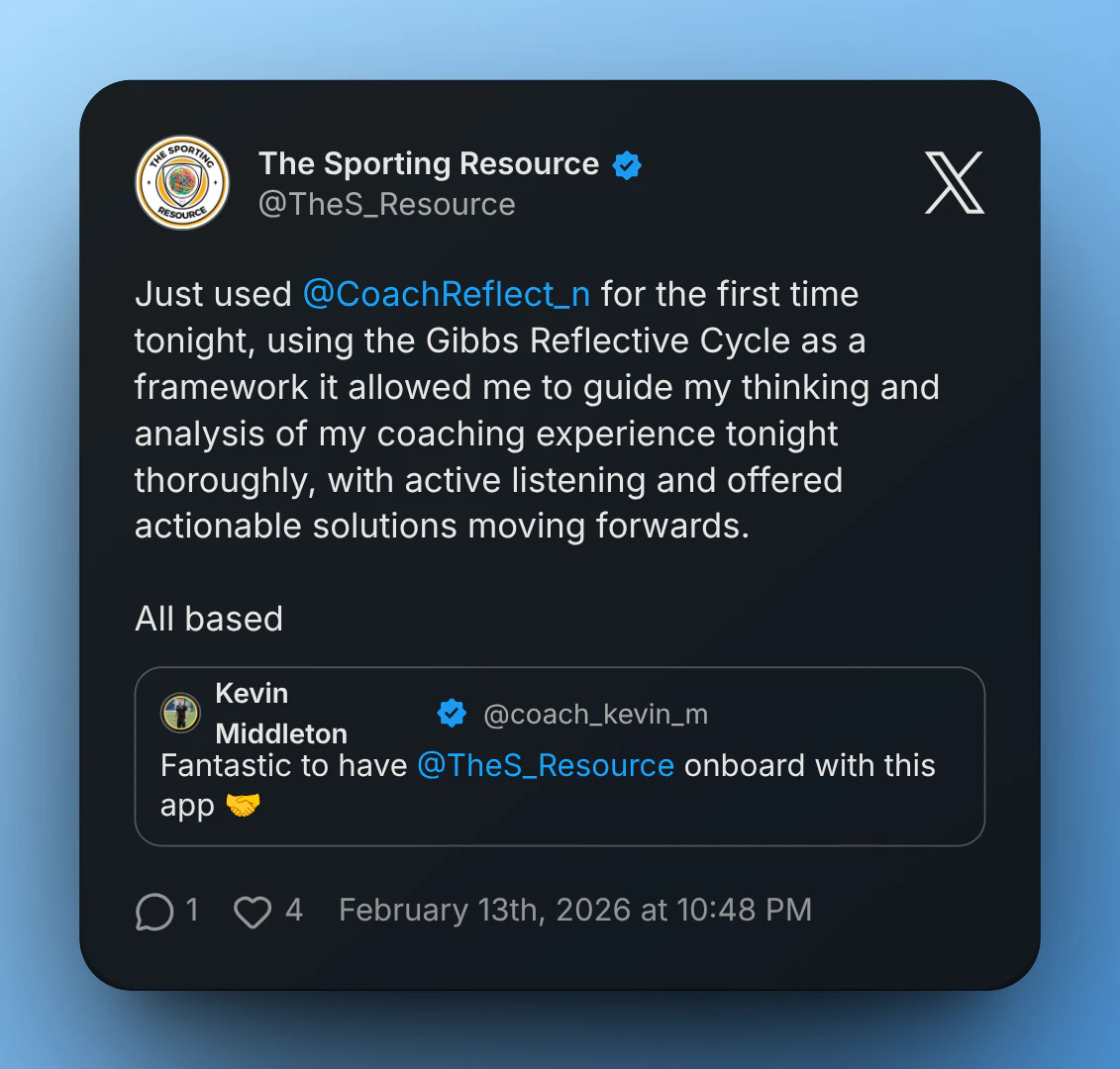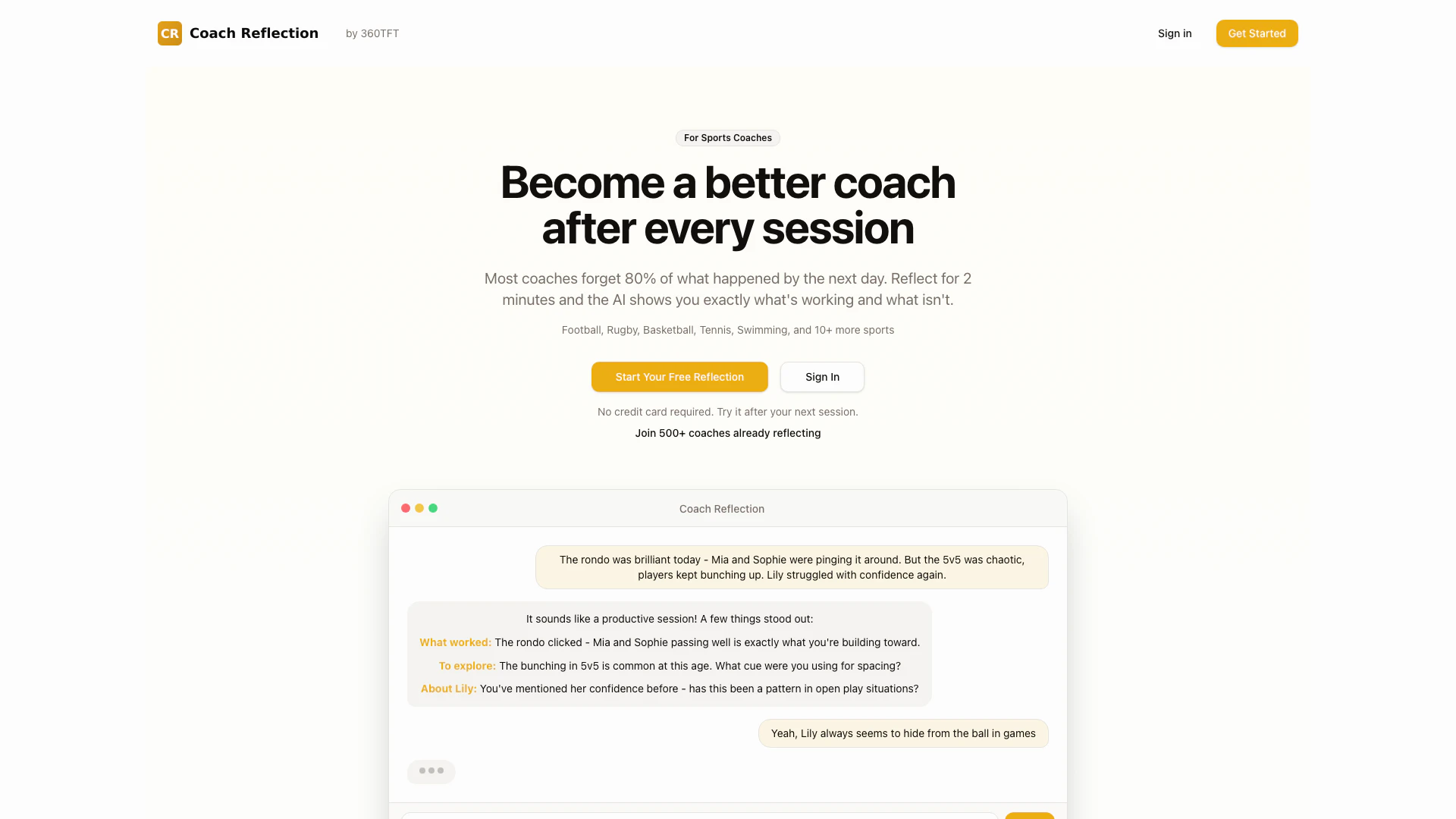 Coach Reflection est un outil de réflexion et de journalisation alimenté par l'IA, conçu spécifiquement pour les entraîneurs de football. Il vous aide à suivre vos séances d'entraînement, à identifier des tendances au fil du temps et à progresser en tant qu'entraîneur grâce à des réflexions guidées après chaque séance.