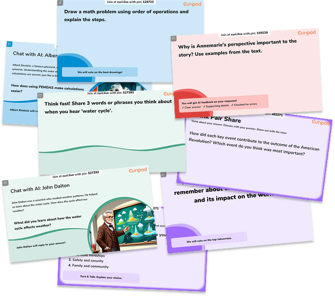 - Engagement Élevé: Les activités de Curipod sont conçues pour réduire les barrières à la participation, encourageant les élèves à interagir activement avec leurs pairs.