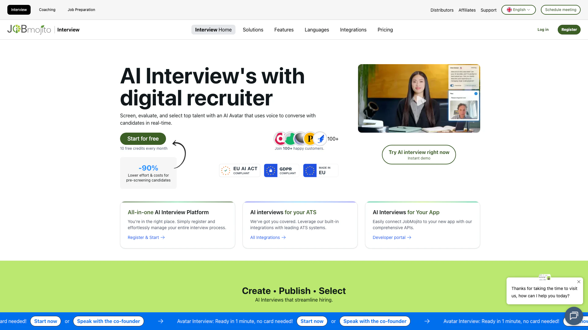 - Entretiens alimentés par l'IA : Réalisez des entretiens à l'aide d'un avatar IA qui interagit avec les candidats en temps réel.