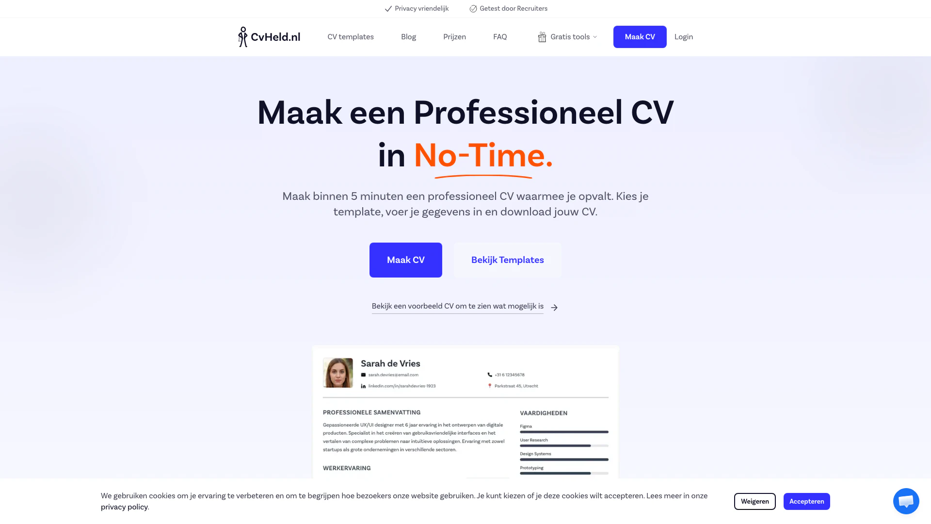- Visitez le site Web de Cvheld et cliquez sur 'Maak CV' pour commencer à créer votre CV.