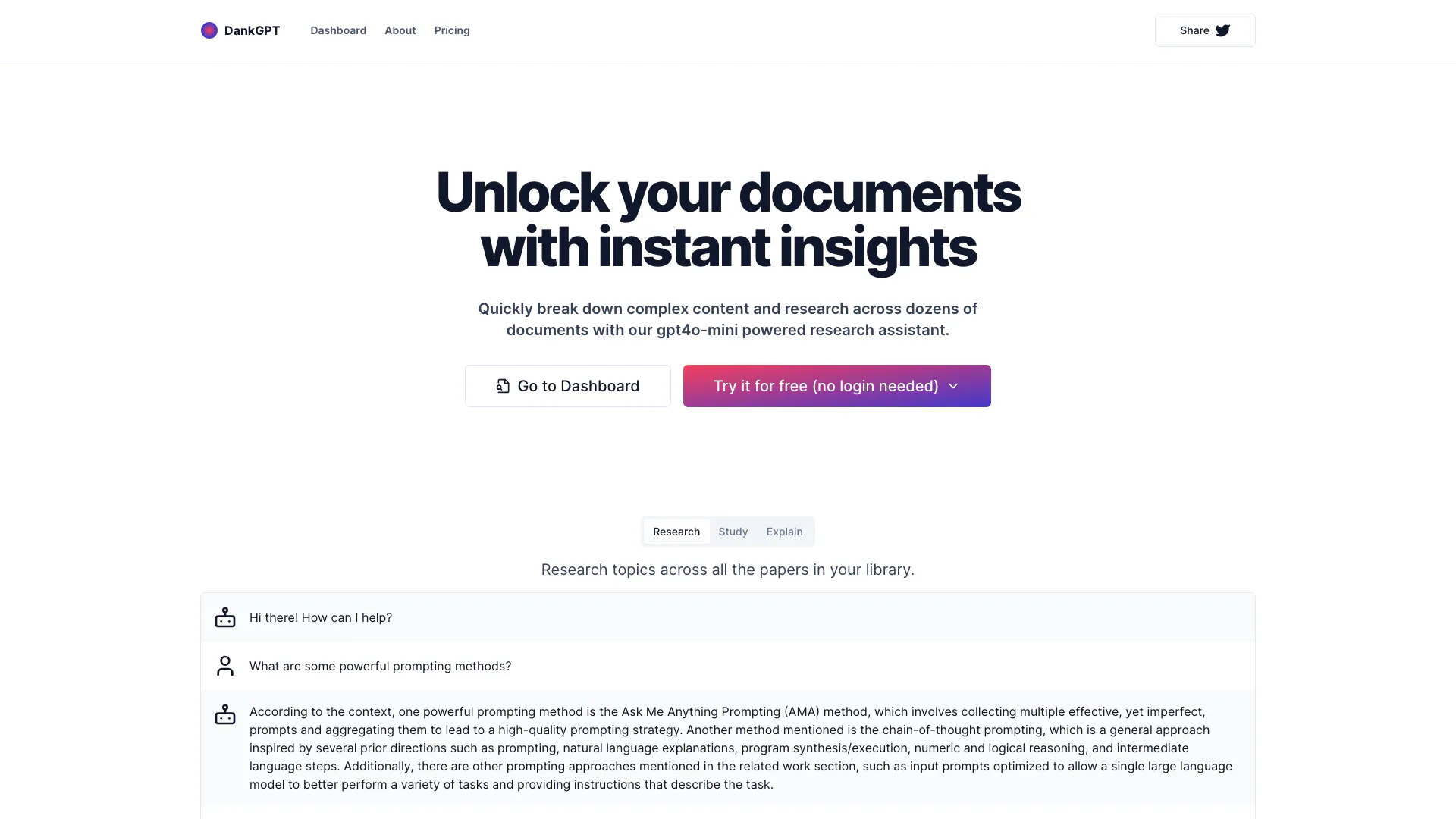 - Assistance à la Recherche Puissante: Dankgpt utilise la technologie GPT-4 pour fournir une assistance à la recherche approfondie, aidant les étudiants et les universitaires à analyser des contenus complexes à travers plusieurs documents.