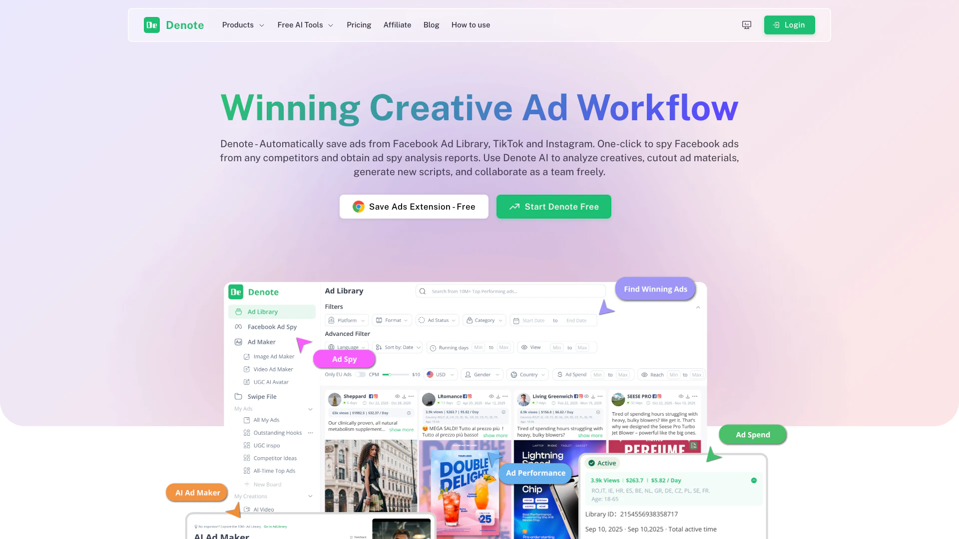 - Installez l'extension Chrome Denote depuis le Chrome Web Store. 2. Une fois installée, naviguez vers TikTok, Instagram ou la bibliothèque d'annonces Facebook et trouvez les annonces que vous souhaitez enregistrer. 3. Cliquez sur l'icône de l'extension Denote pour enregistrer les annonces directement dans votre compte Denote. 4. Utilisez les fonctionnalités IA de Denote pour générer des scripts vidéo ou analyser les annonces enregistrées pour obtenir des informations et des métriques de performance. 5. Collaborez avec votre équipe en partageant les annonces enregistrées et en discutant des idées créatives sur la plateforme.