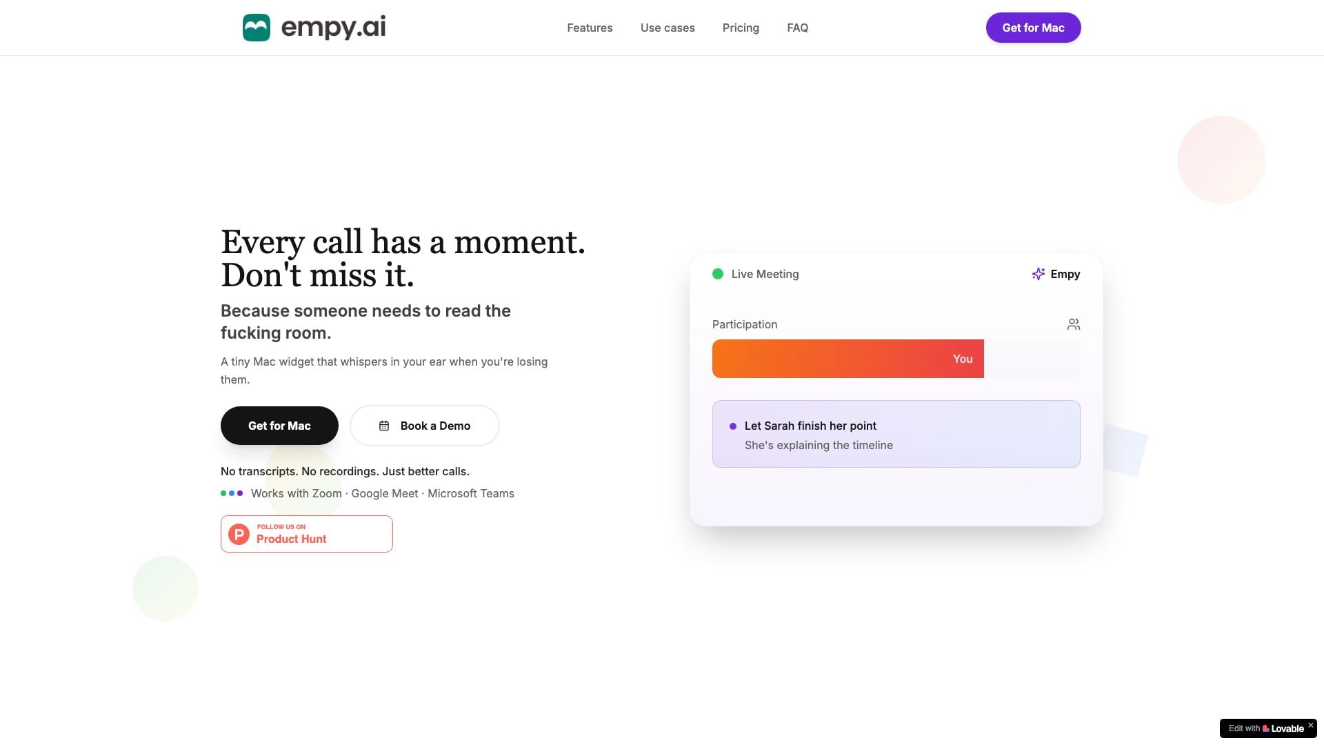 - Intelligence en temps réel: Empy fournit des signaux en temps réel pour aider à maintenir une conversation équilibrée, garantissant que tous les participants ont la chance de contribuer.