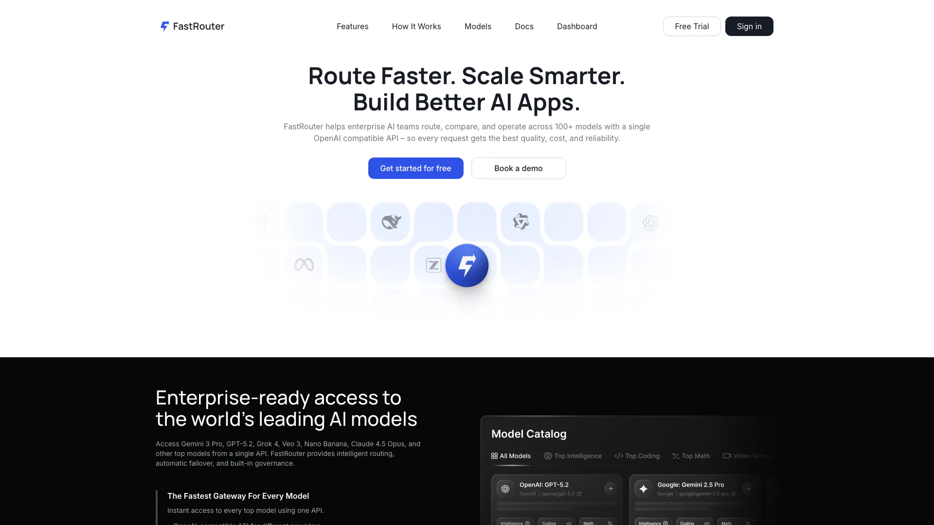 - Accès unifié à plusieurs modèles: FastRouter fournit une API unique pour accéder à plus de 100 modèles de langage AI, simplifiant l'intégration et la gestion pour les entreprises.