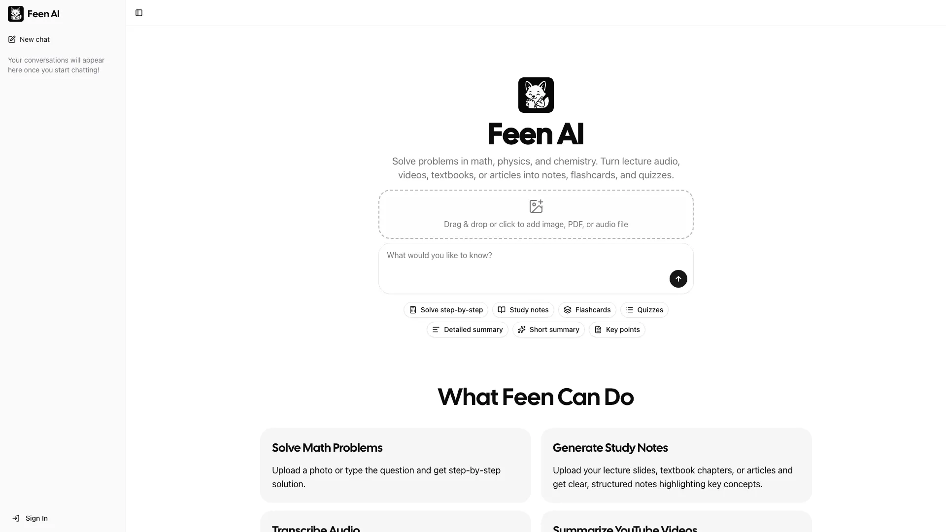 Feenai est un outil d'IA innovant conçu pour aider les étudiants et les chercheurs à résoudre des problèmes complexes en mathématiques, en physique et en chimie. Il transforme divers matériels éducatifs tels que des enregistrements audio de cours, des vidéos, des manuels scolaires et des articles en notes structurées, en flashcards et en quiz. Avec Feenai, les utilisateurs peuvent facilement télécharger leurs supports d'étude et recevoir des solutions claires et étape par étape, ce qui en fait une ressource essentielle pour un apprentissage efficace et une préparation aux études.
