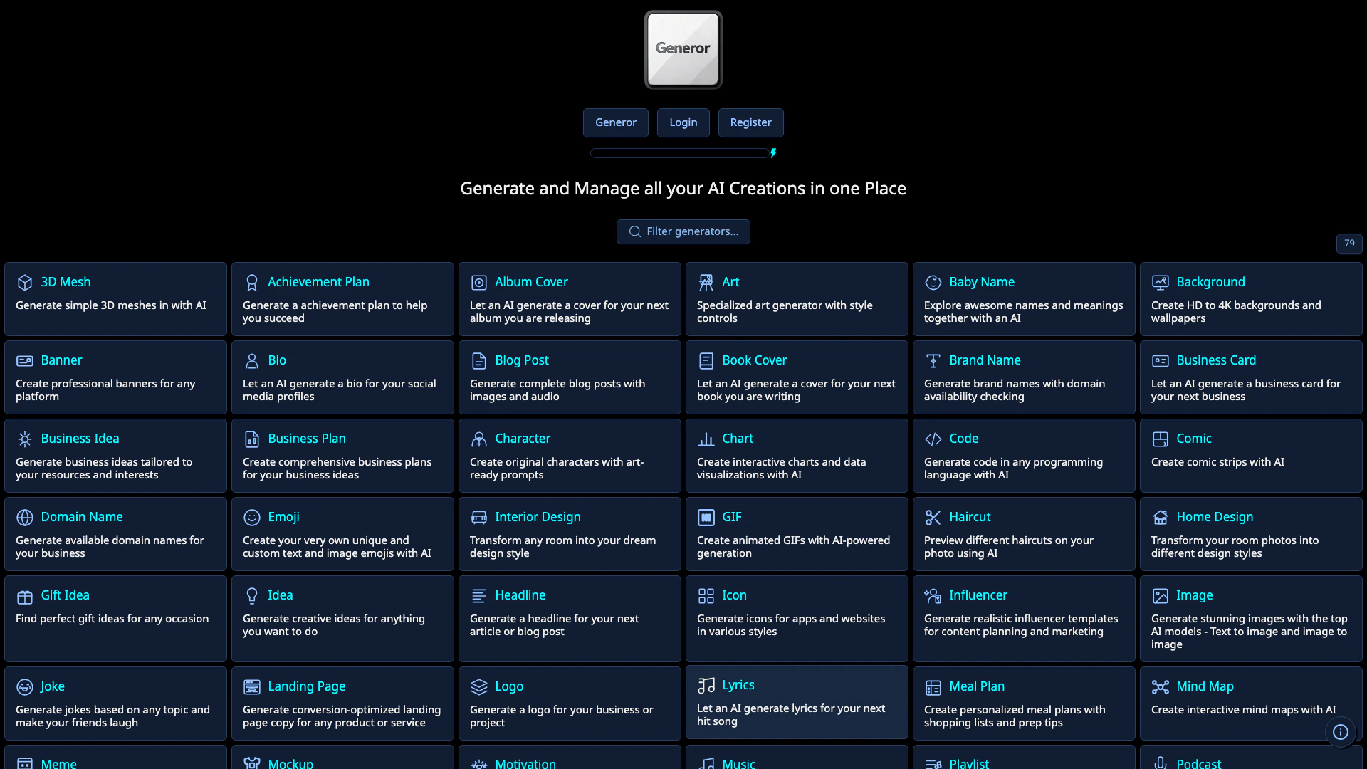 - Parcourez les différents générateurs disponibles sur la plateforme, tels que les générateurs d'art, de musique ou de plans d'affaires.