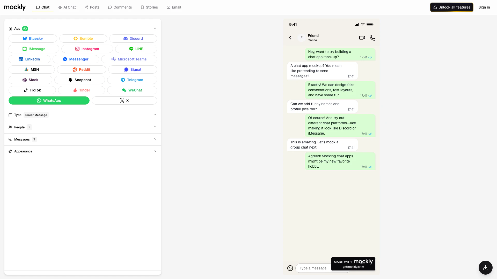 Mockly est un outil en ligne gratuit pour créer des captures d'écran de conversations fictives réalistes, des publications sur les réseaux sociaux et des maquettes. Parfait pour les créateurs de contenu, les marketeurs, les designers et quiconque a besoin de maquettes de messages professionnelles pour des usages légitimes comme des supports marketing, du contenu éducatif ou des projets créatifs.