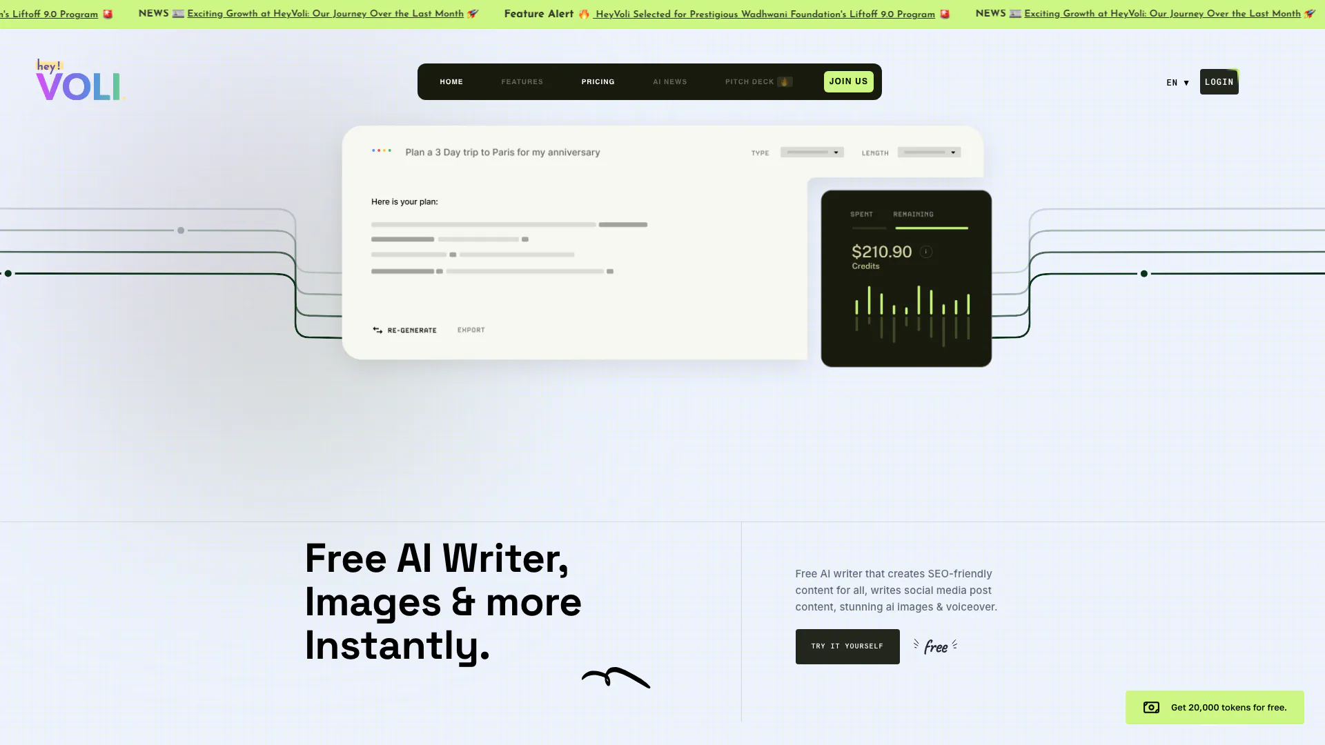 - Accès Gratuit avec des Limites Générales: HeyVoli propose un niveau gratuit qui permet aux utilisateurs de générer jusqu'à 20 000 mots et 5 images, ce qui en fait une option économique pour les particuliers et les petites entreprises.