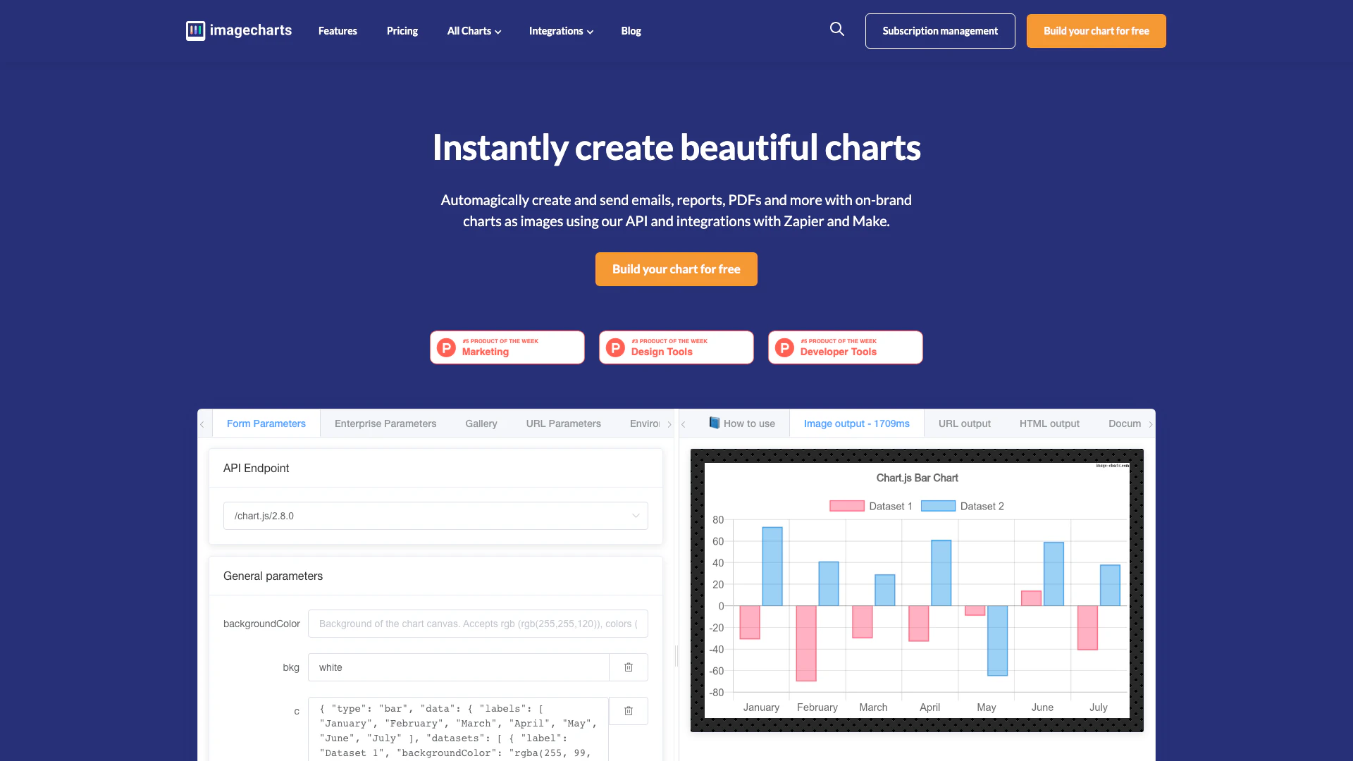 - API personnalisée pour les développeurs: Image-Charts fournit une API personnalisée qui permet aux développeurs d'intégrer des capacités de génération de graphiques dans leurs applications, facilitant ainsi une expérience utilisateur sur mesure.
