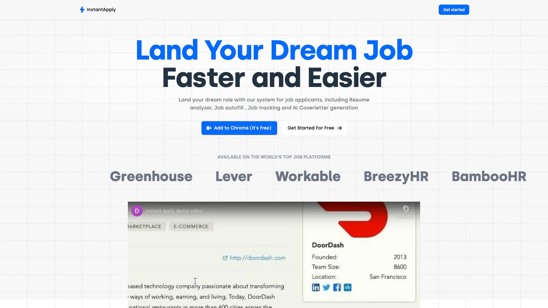 Instantapply est un système qui aide les candidats à décrocher leur emploi de rêve plus rapidement et plus facilement, en offrant une analyse de CV, un remplissage automatique de postes, un suivi des candidatures et une génération de lettres de motivation par IA.