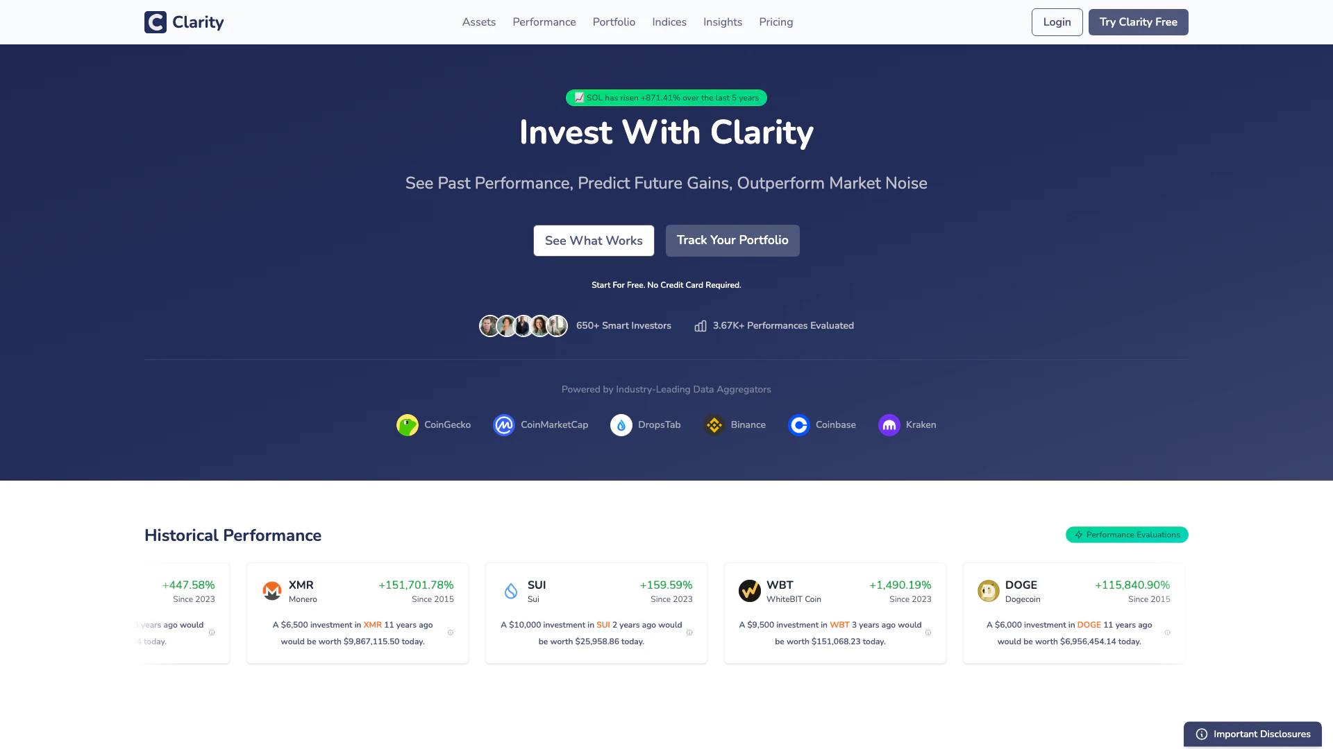 - Suivi de Performance Complet: Clarity permet aux utilisateurs de suivre la performance historique de leurs actifs et portefeuilles crypto, fournissant des informations pour prendre des décisions d'investissement éclairées à l'avenir.