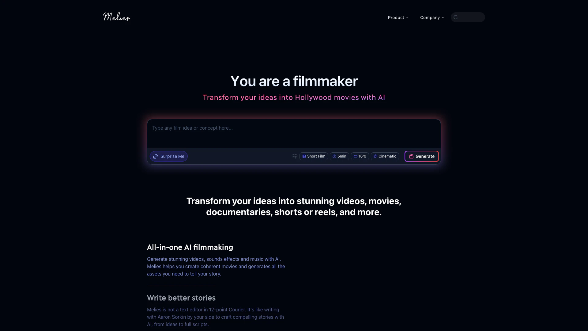 - Réalisation de films par IA: Melies utilise la technologie IA pour transformer des idées en films de haute qualité, permettant aux utilisateurs de créer facilement des films, des documentaires et plus encore.