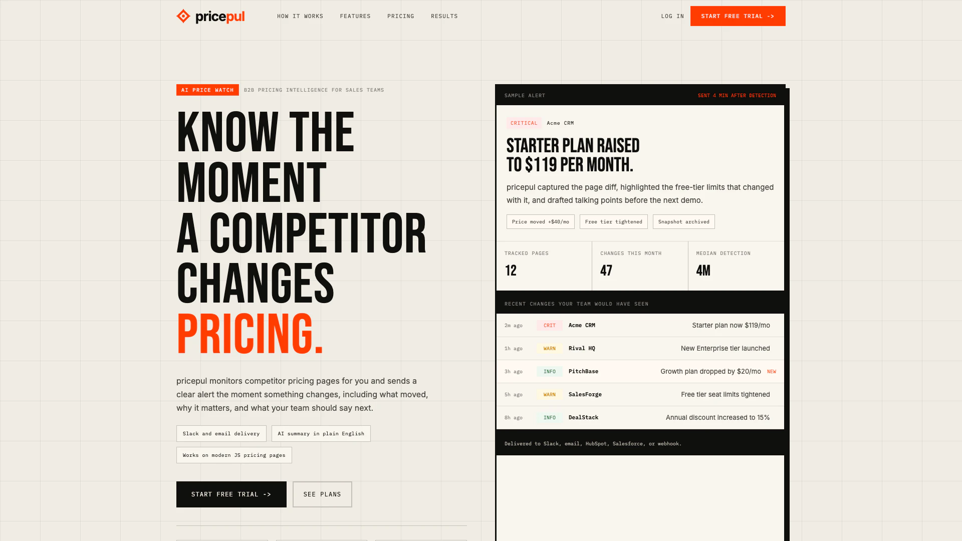 Pricepul surveille les pages de tarification des concurrents et envoie des alertes lorsque des changements se produisent. Il capture un instantané de référence de la page de tarification, vérifie les mises à jour toutes les 6 à 24 heures et fournit des résumés rédigés par IA et des points de discussion pour les équipes de vente.