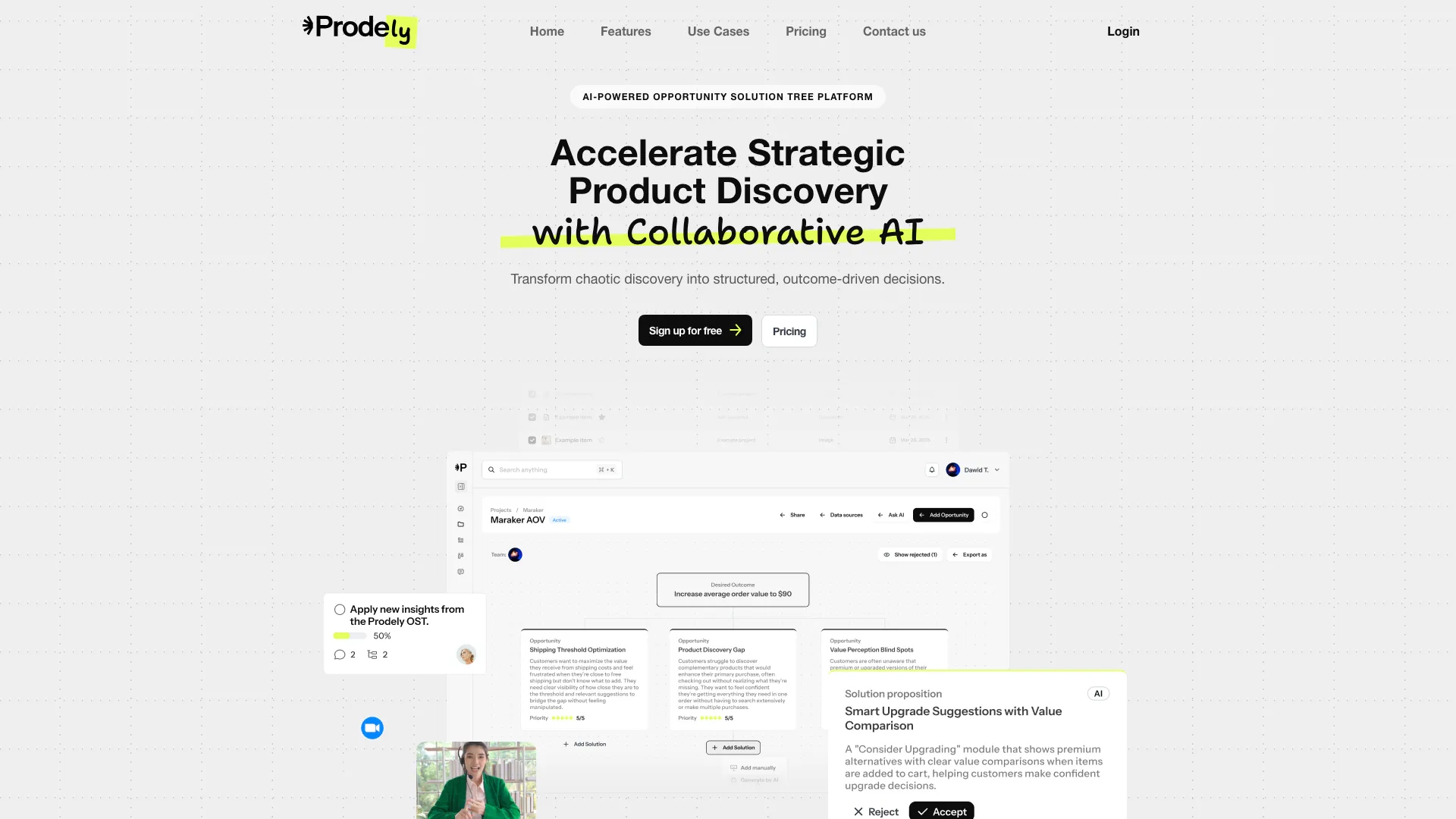 Prodely est une plateforme de découverte de produits alimentée par l'IA qui aide les équipes produit à structurer, planifier et exécuter un travail de découverte continu avec une vitesse et une précision sans précédent. Transformant le chaos de la découverte en décisions structurées et axées sur les résultats.