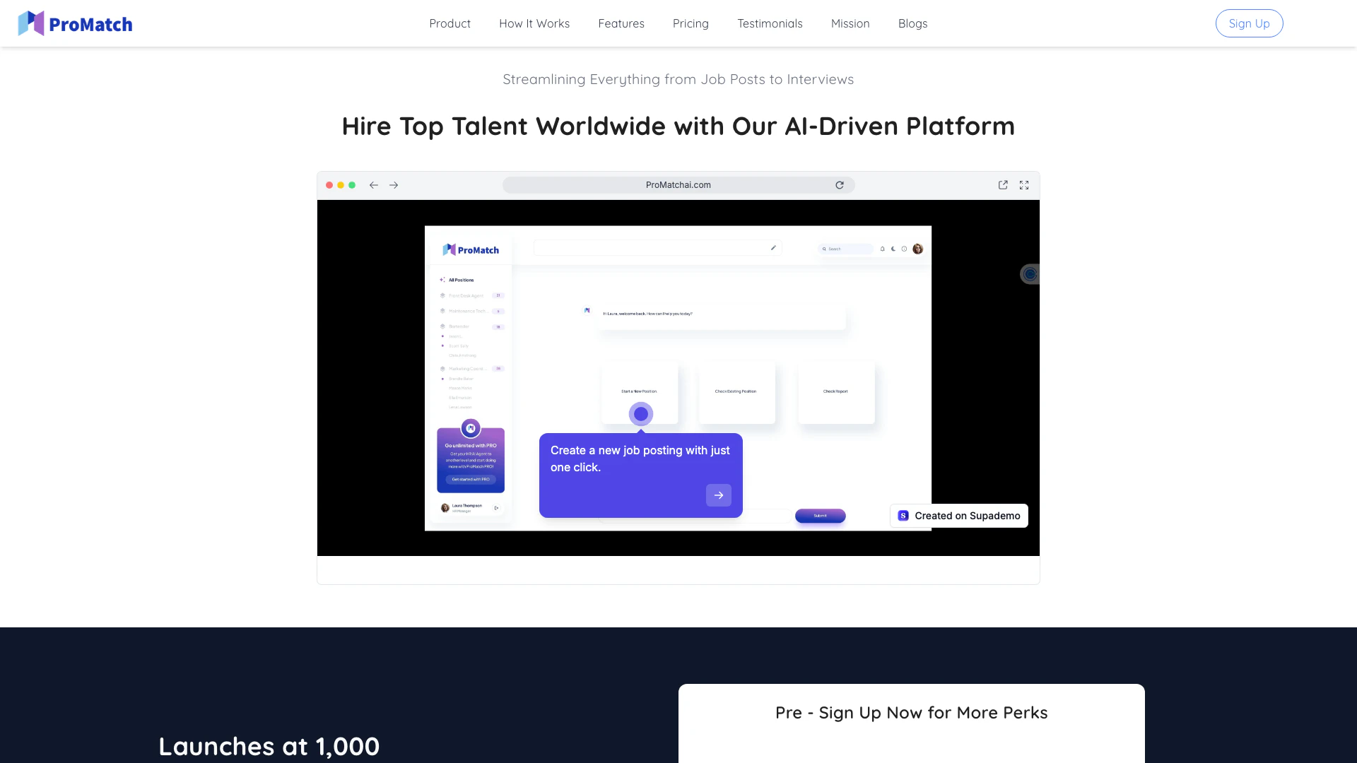 ProMatch est conçu pour les entreprises de toutes tailles cherchant à améliorer leurs processus de recrutement. Il est particulièrement bénéfique pour les équipes RH et les responsables du recrutement qui doivent rationaliser le filtrage et les entretiens des candidats. Les startups et les entreprises en croissance peuvent tirer parti de ProMatch pour gagner du temps et des ressources, tandis que les grandes organisations peuvent utiliser ses fonctionnalités avancées pour gérer efficacement un grand nombre de candidatures. De plus, ProMatch est idéal pour les entreprises qui souhaitent améliorer l'expérience des candidats et prendre des décisions d'embauche basées sur des données.