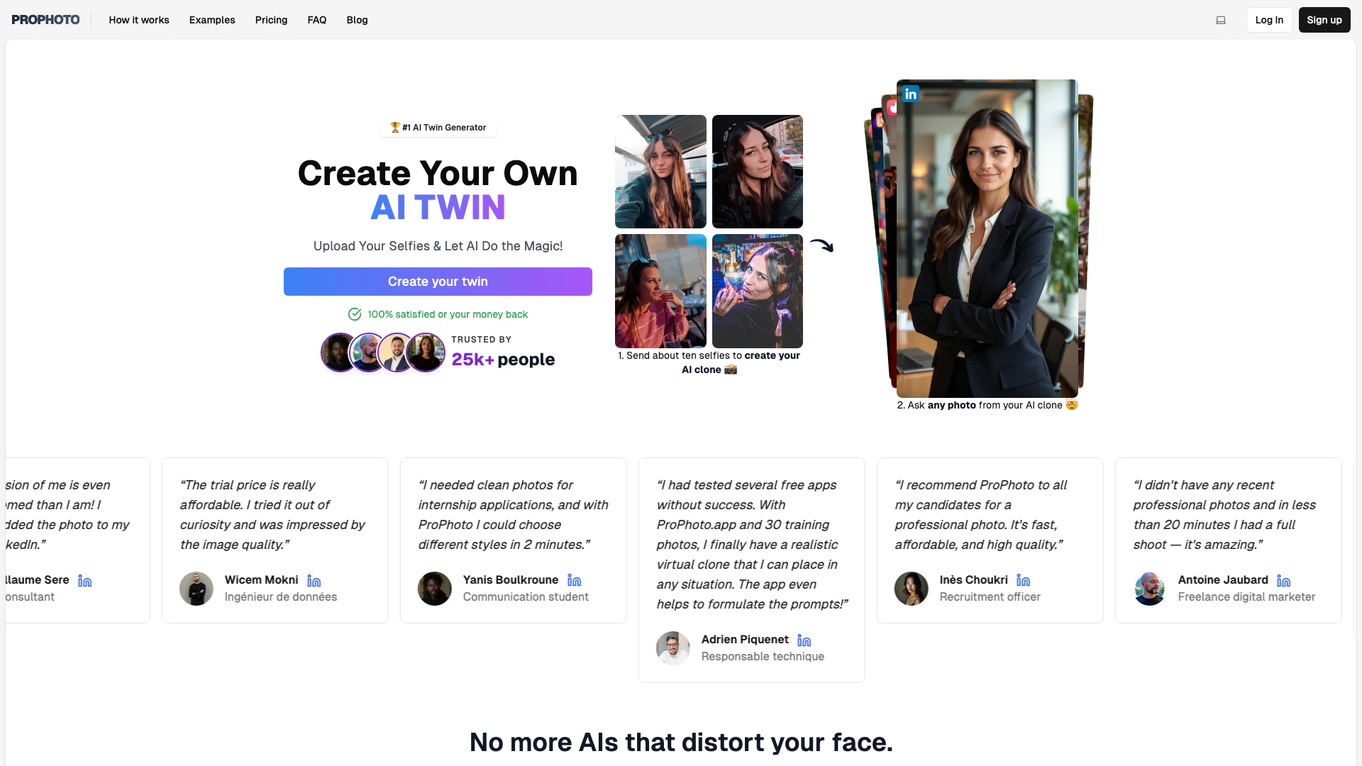 ProPhoto utilise une technologie AI avancée pour transformer vos selfies en images de qualité professionnelle. Vous téléchargez vos selfies, et l'AI les traite pour créer des photos réalistes en haute résolution qui vous ressemblent.