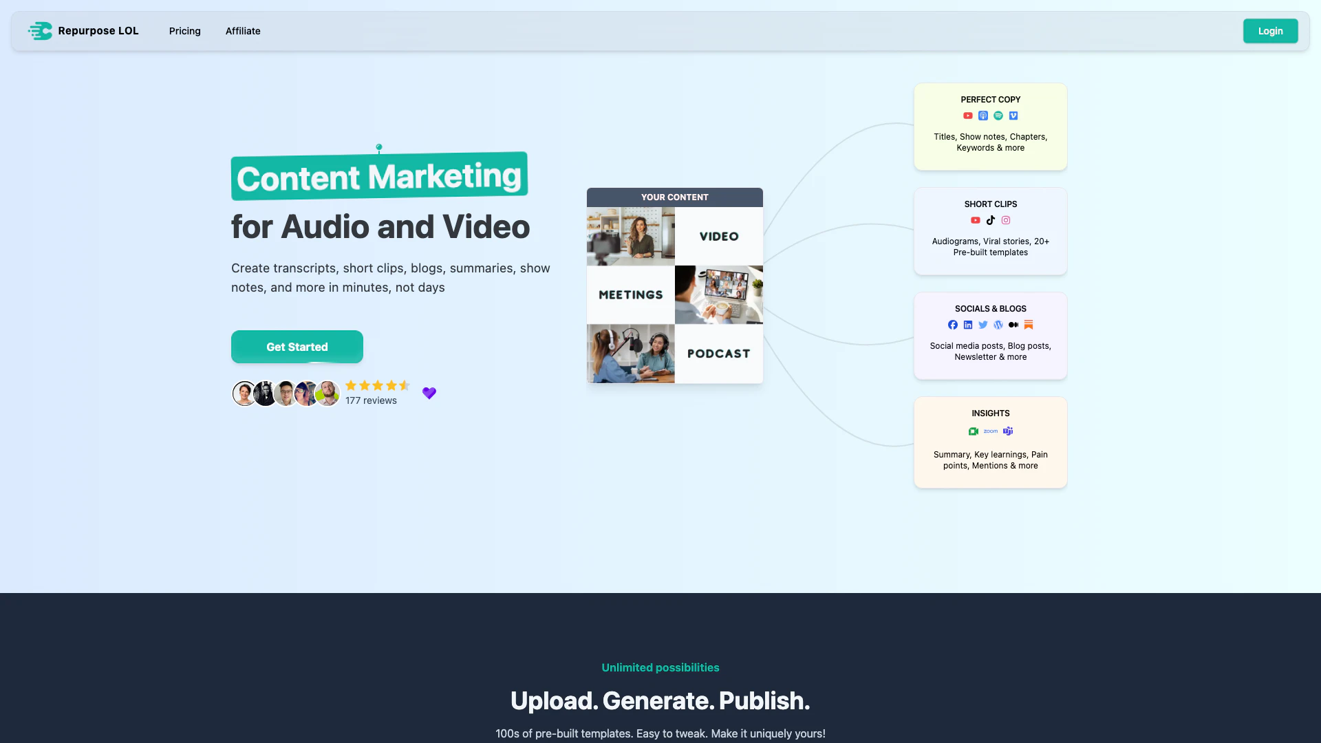 - Fonctionnalités d'économie de temps: Repurpose permet aux utilisateurs d'économiser plus de 60 heures de travail par vidéo en automatisant des tâches de génération de contenu telles que les transcriptions, les résumés et les publications sur les réseaux sociaux.
