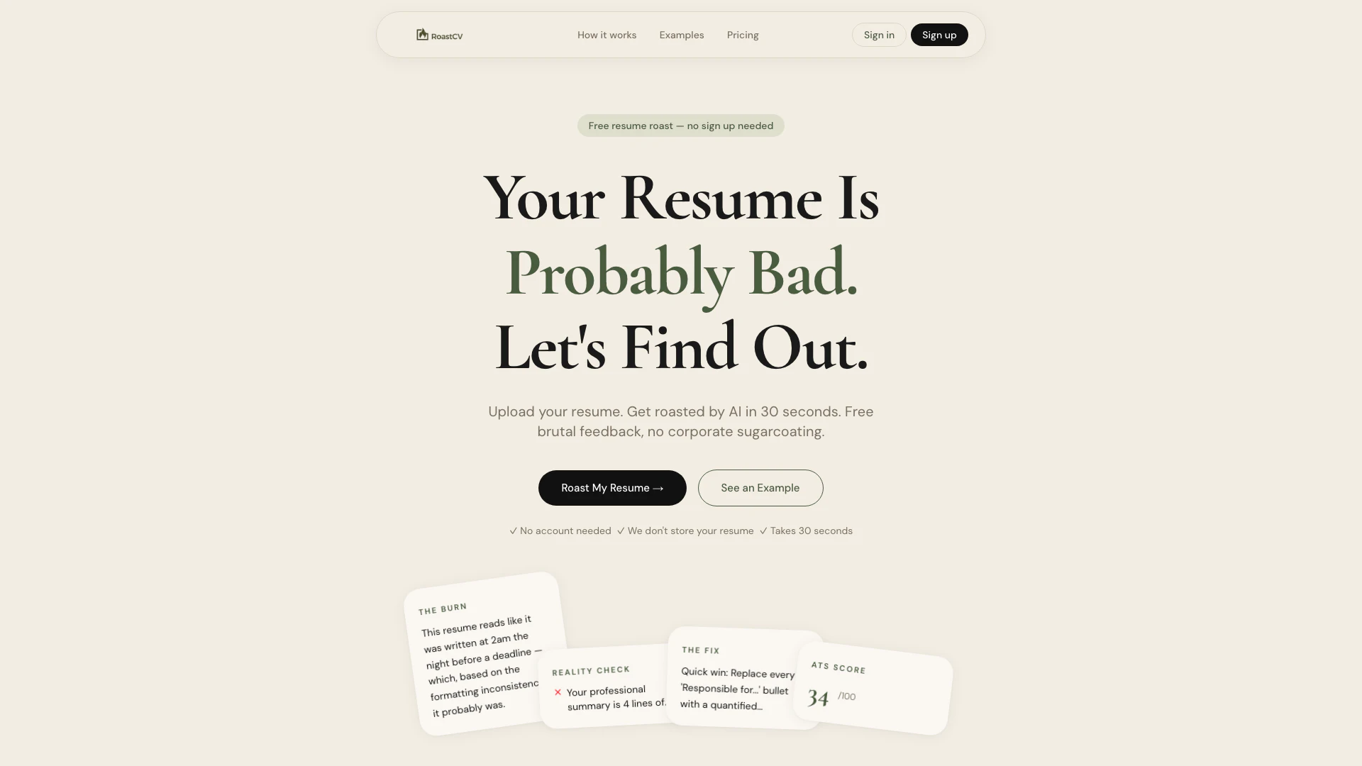- Roast initial gratuit : Aucune inscription n'est requise pour commencer avec un roast de CV gratuit.