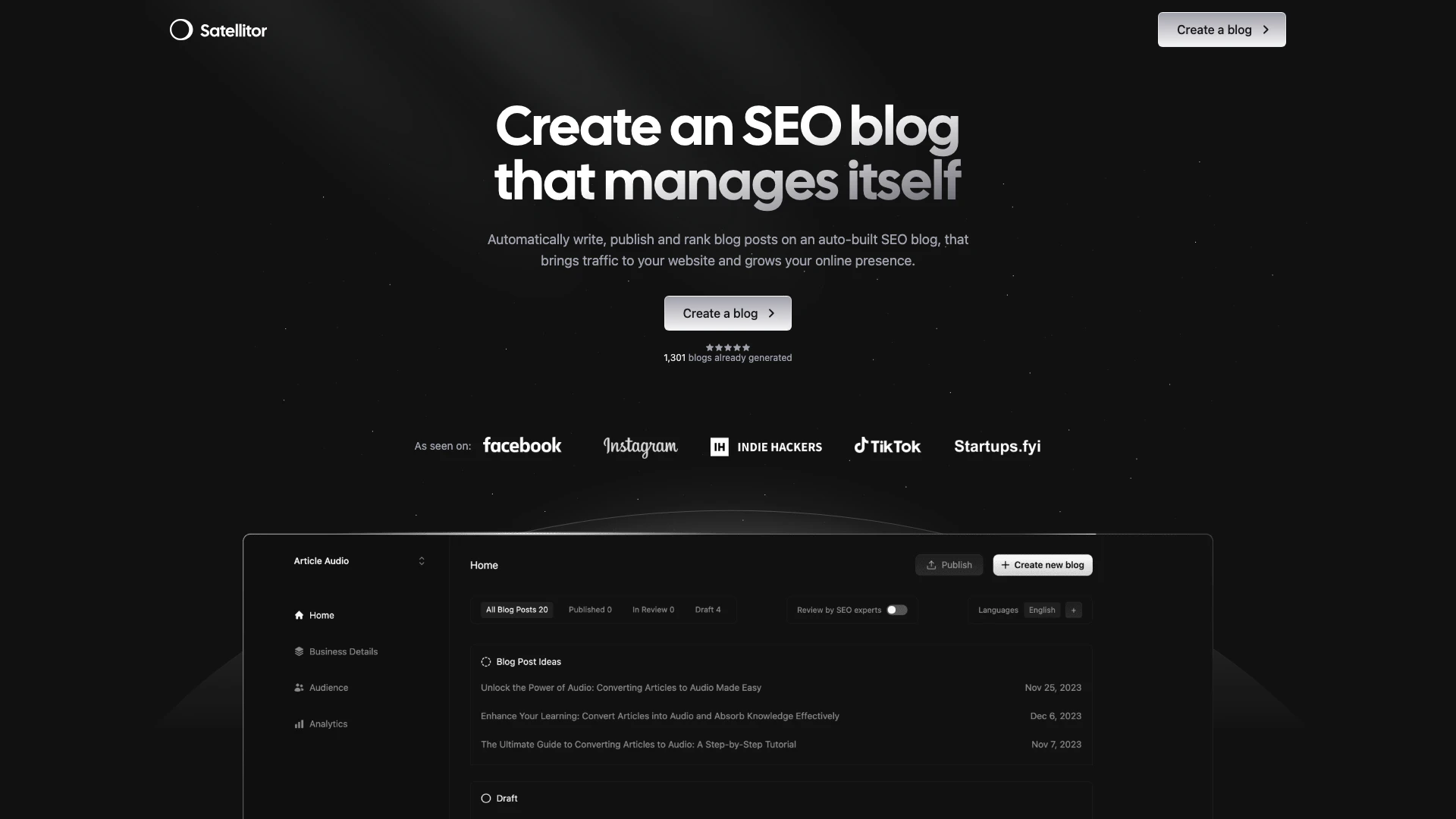 - Création de contenu automatisée: Satellitor automatise l'écriture et la publication de blogs SEO, permettant ainsi d'économiser du temps pour les entrepreneurs et les équipes marketing occupés.