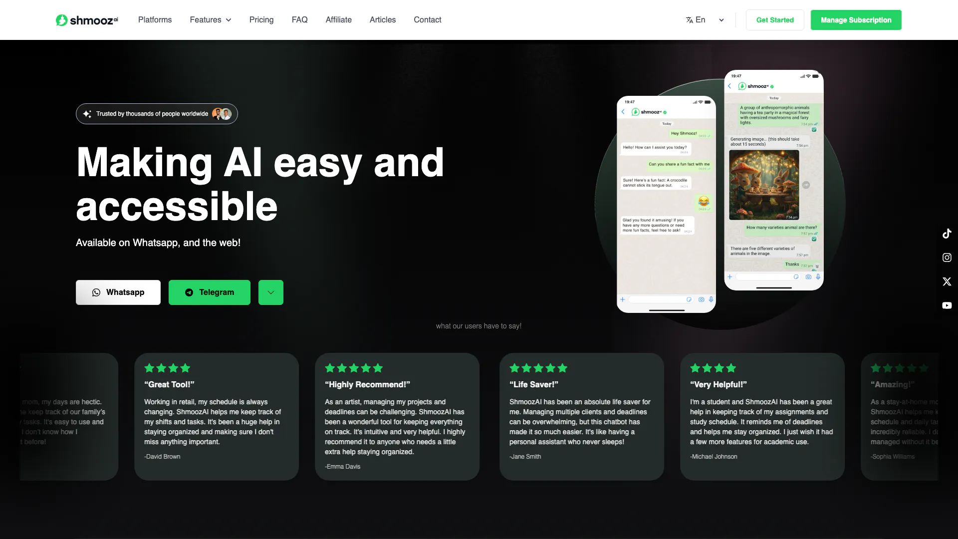 - Plates-formes Multiples Disponibles: Shmooz AI est disponible à la fois sur Whatsapp et sur le web, offrant des options flexibles aux utilisateurs pour accéder à ses fonctionnalités.