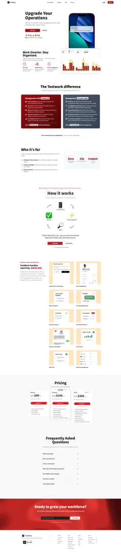 TextWork est conçu pour les équipes et les organisations qui nécessitent une collecte de données structurée sans les tracas traditionnels des formulaires ou des e-mails. Il est particulièrement bénéfique pour les responsables et les chefs d'équipe ayant besoin de mises à jour quotidiennes et de rapports d'avancement, les gestionnaires de biens collectant des demandes de maintenance, et les propriétaires d'entreprises suivant la performance des employés et les retours des clients. Essentiellement, toute entreprise cherchant à améliorer ses processus de communication et de reporting peut tirer parti des capacités de TextWork.