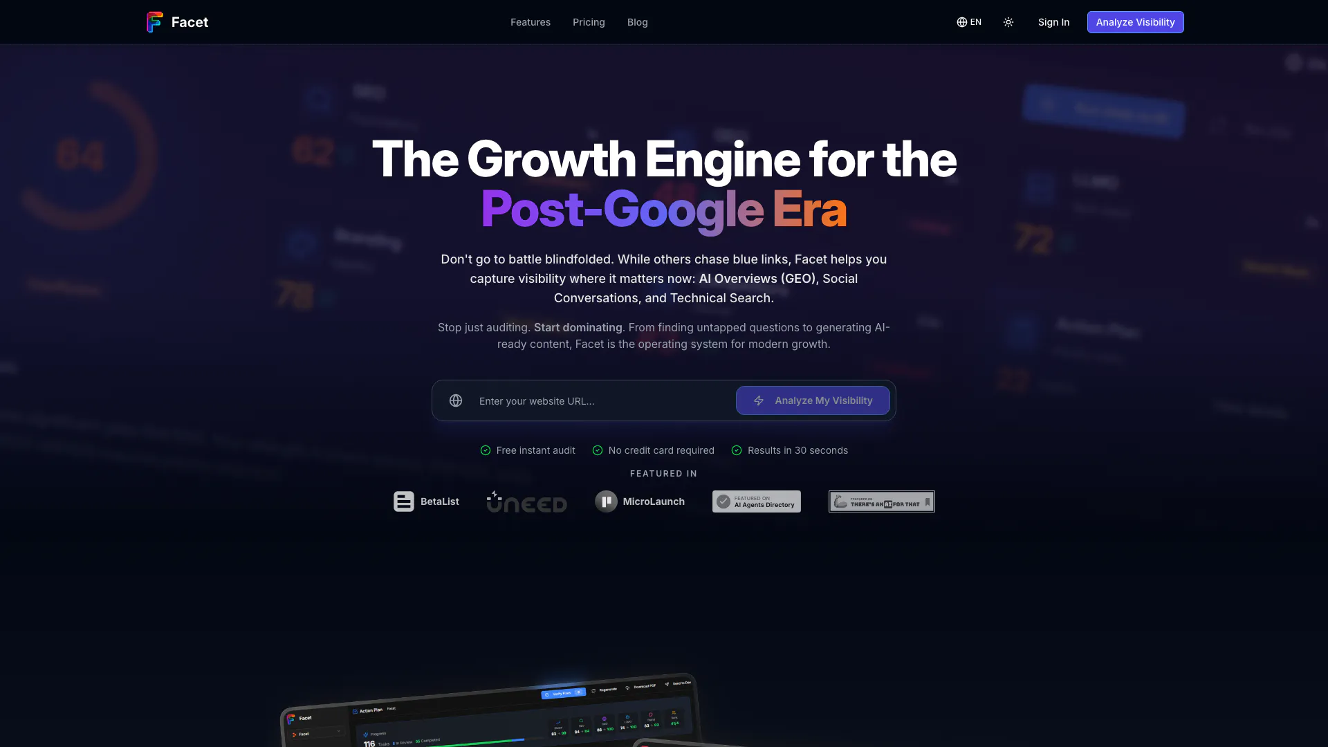 - Audit Instantané Gratuit: Facet propose un niveau gratuit qui permet aux utilisateurs de réaliser des audits SEO instantanés sans nécessiter de carte de crédit, rendant cela accessible à tous.