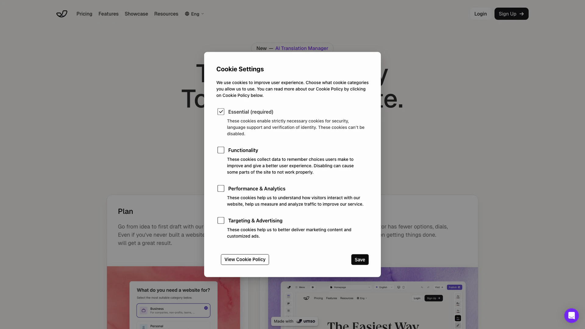 Umso est conçu pour un large éventail d'utilisateurs, y compris les entrepreneurs, les propriétaires de petites entreprises, les freelances et les particuliers qui souhaitent établir un site Web personnel. Il s'adresse à ceux qui ont peu ou pas de compétences techniques, ce qui en fait un excellent choix pour quiconque cherchant à créer rapidement et efficacement une présence en ligne professionnelle. De plus, il convient aux spécialistes du marketing et aux créateurs de contenu qui nécessitent des fonctionnalités de blogging et d'analyse intégrées pour améliorer leur stratégie numérique.