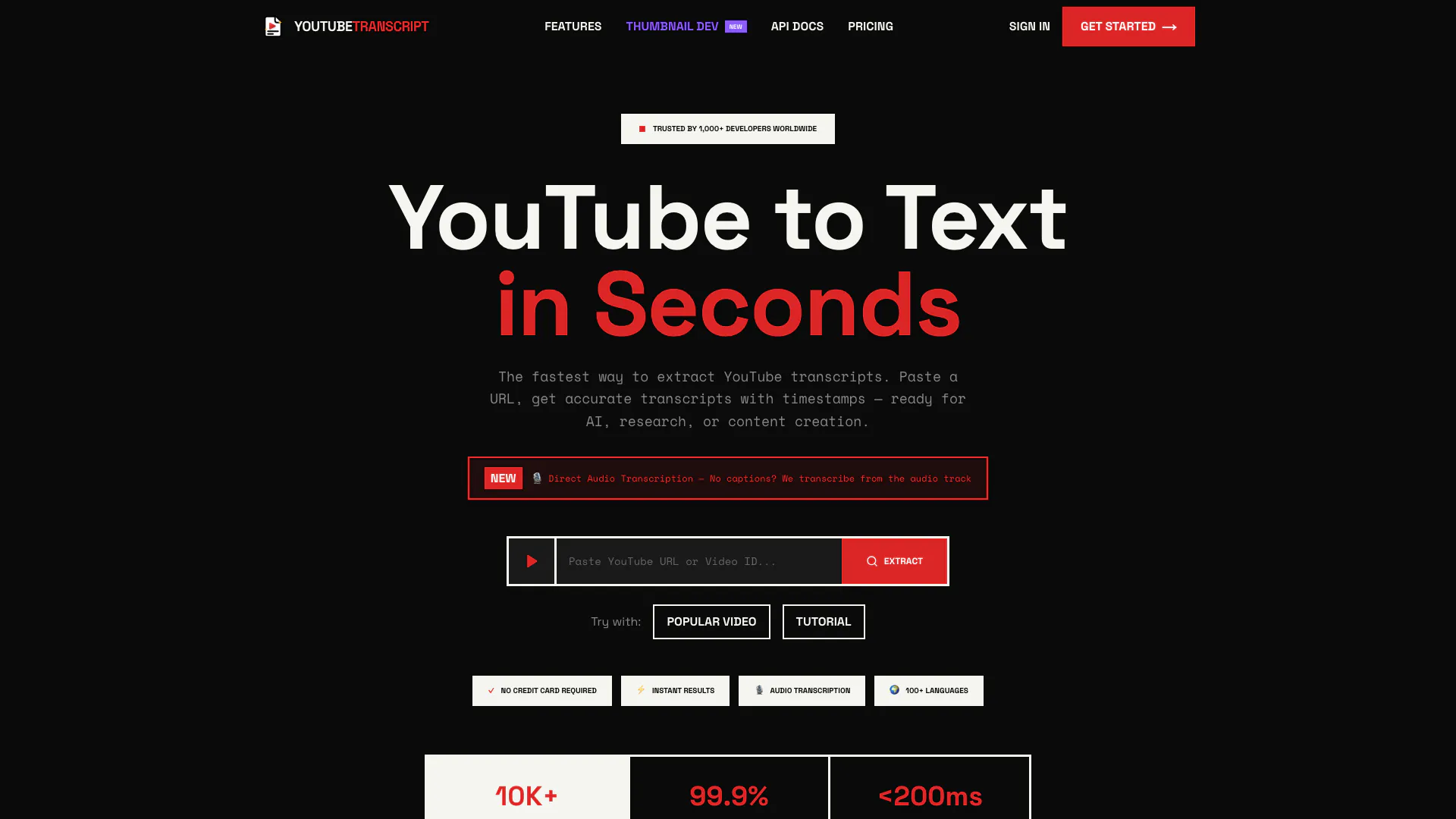 - Extraction de Transcription Rapide: Obtenez des transcriptions YouTube précises en moins de 2 secondes, ce qui le rend idéal pour la création rapide de contenu et la recherche.